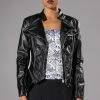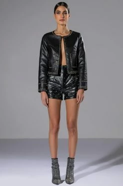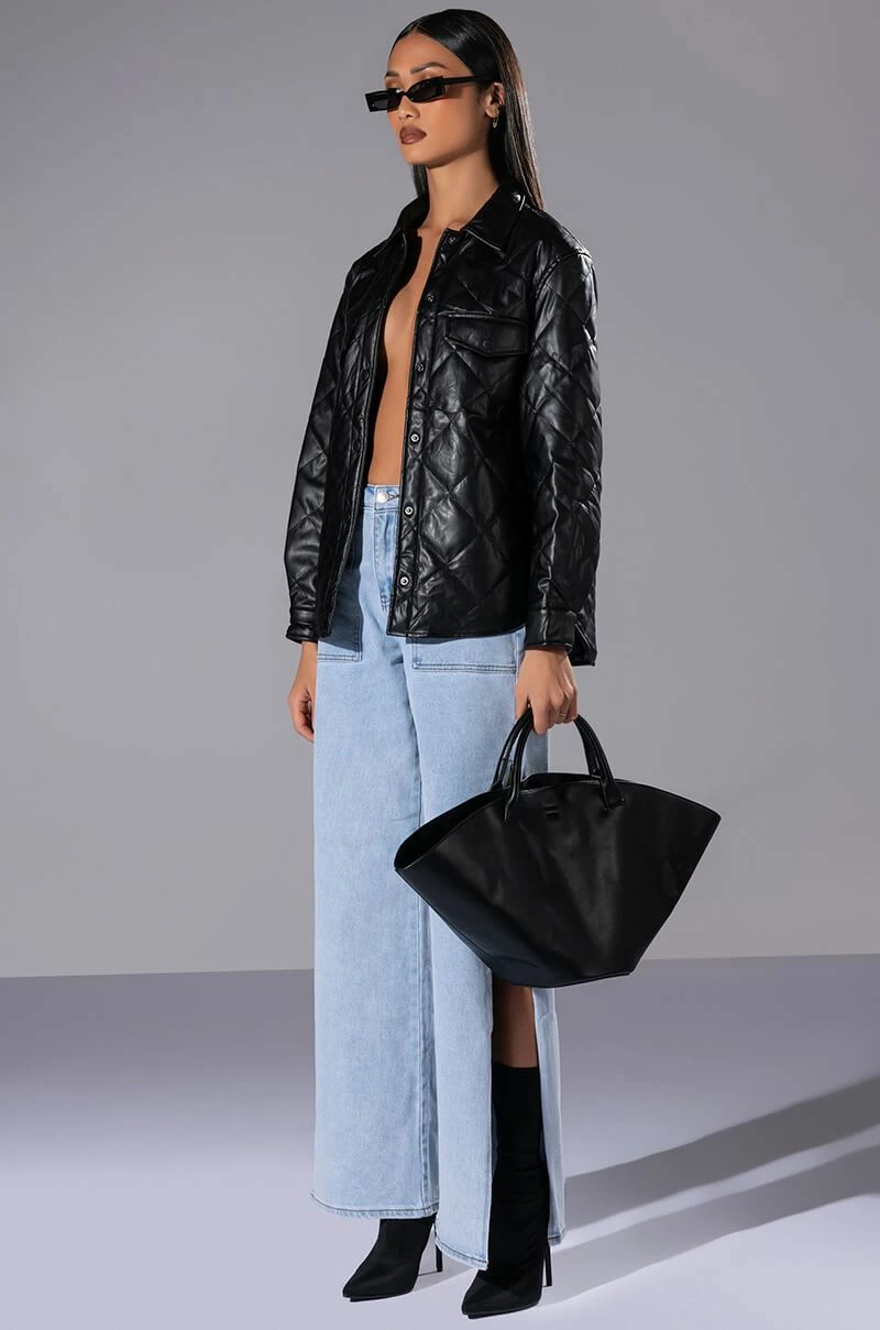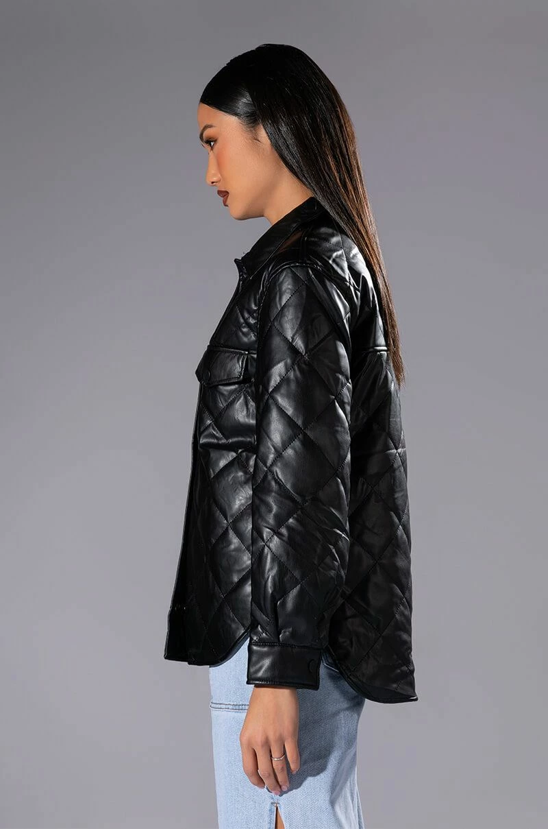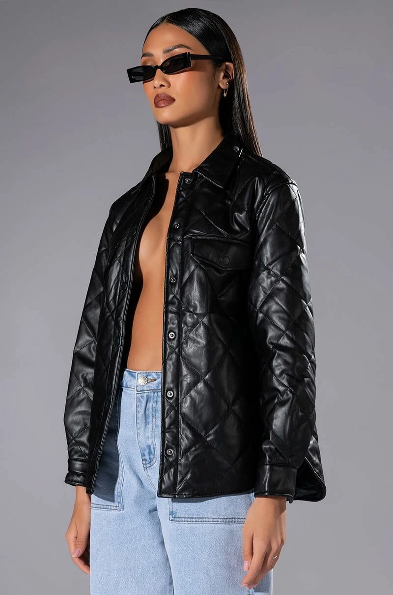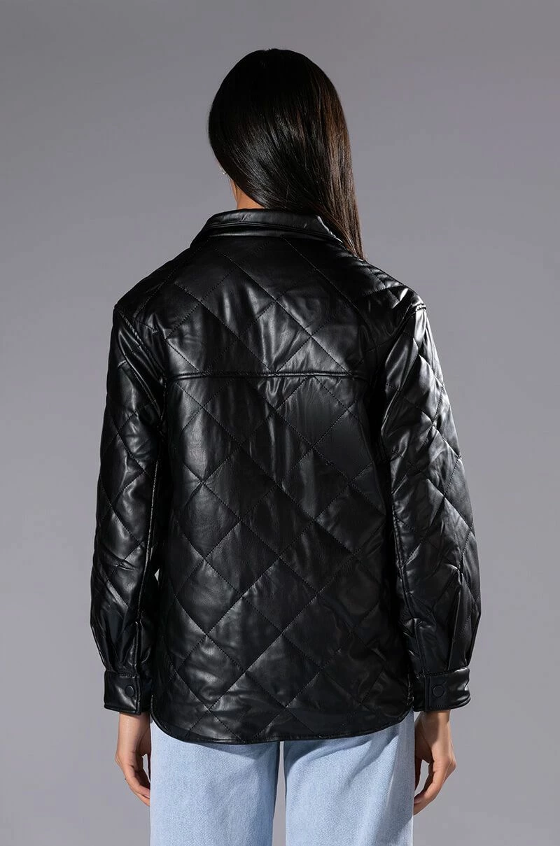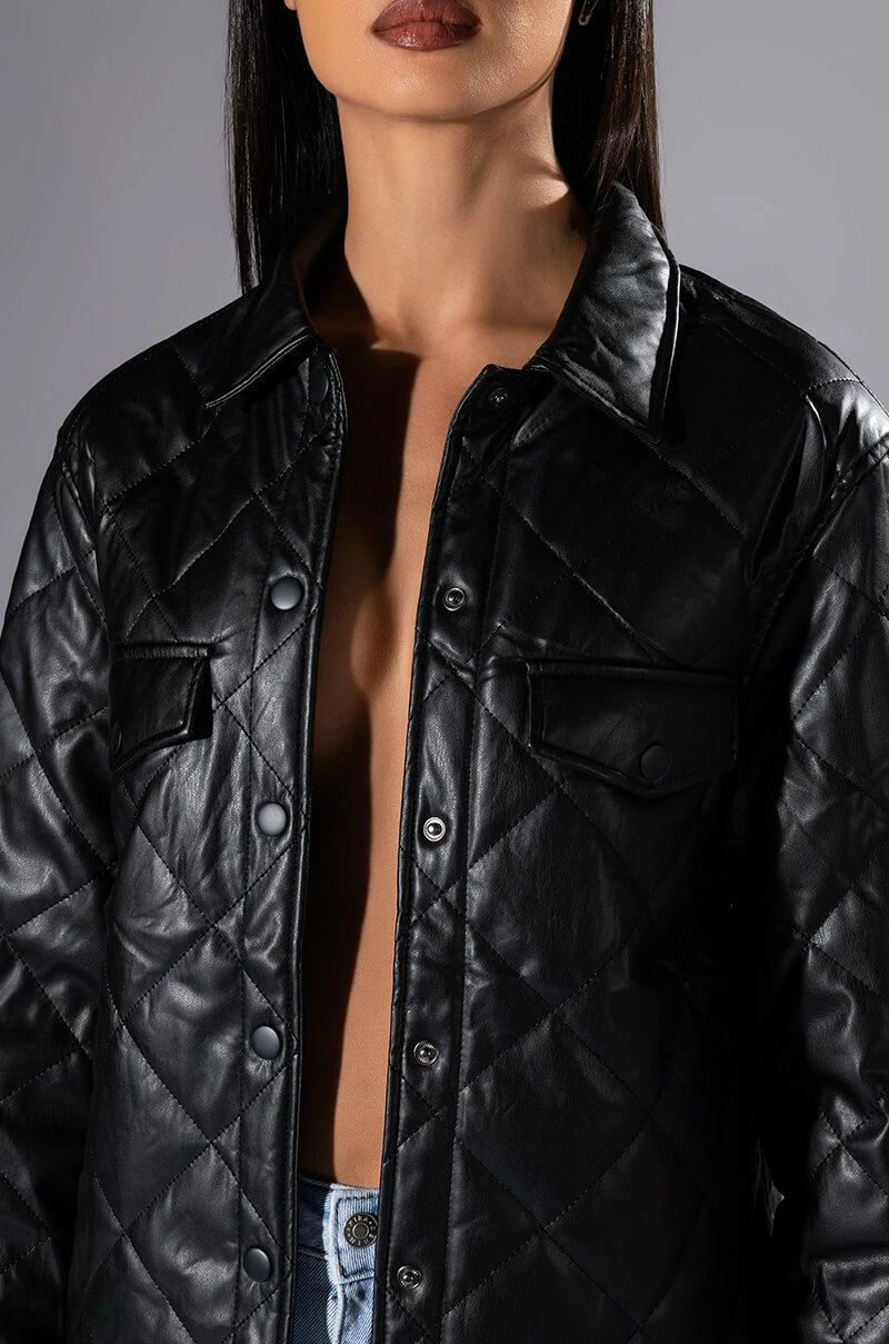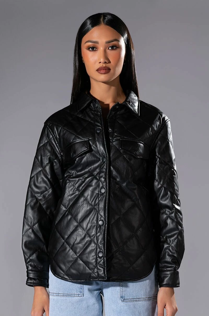 The AKIRA Label Kate Quilted Faux Leather Button Down Shirt is made from a cushioned faux leather fabrication and features quilted patterning, a collared neckline, long sleeves with snap button cuffs, mock chest snap button flap pockets, a boxy fit, a rounded hem, and snap button down front closures. Pair this piece with fitted leggings and combat boots to complete your cozy seasonal look.