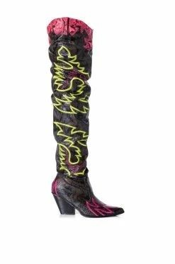 The Kelsey Over The Knee Western Boot In Brown Multi is made from a snakeskin-embossed synthetic upper and features a thigh-high shaft, Western-inspired neon stitching, a pointed toe silhouette, a chunky heel, pull tabs, and a pull-on fit.