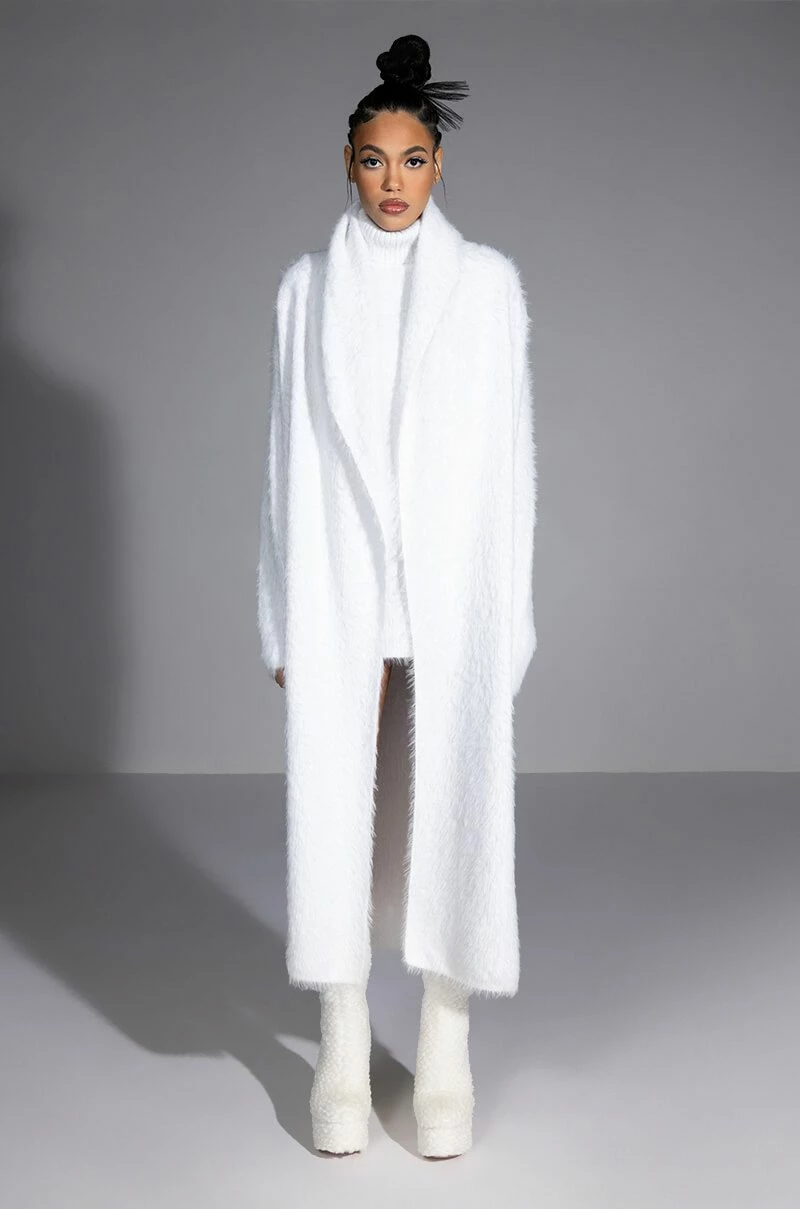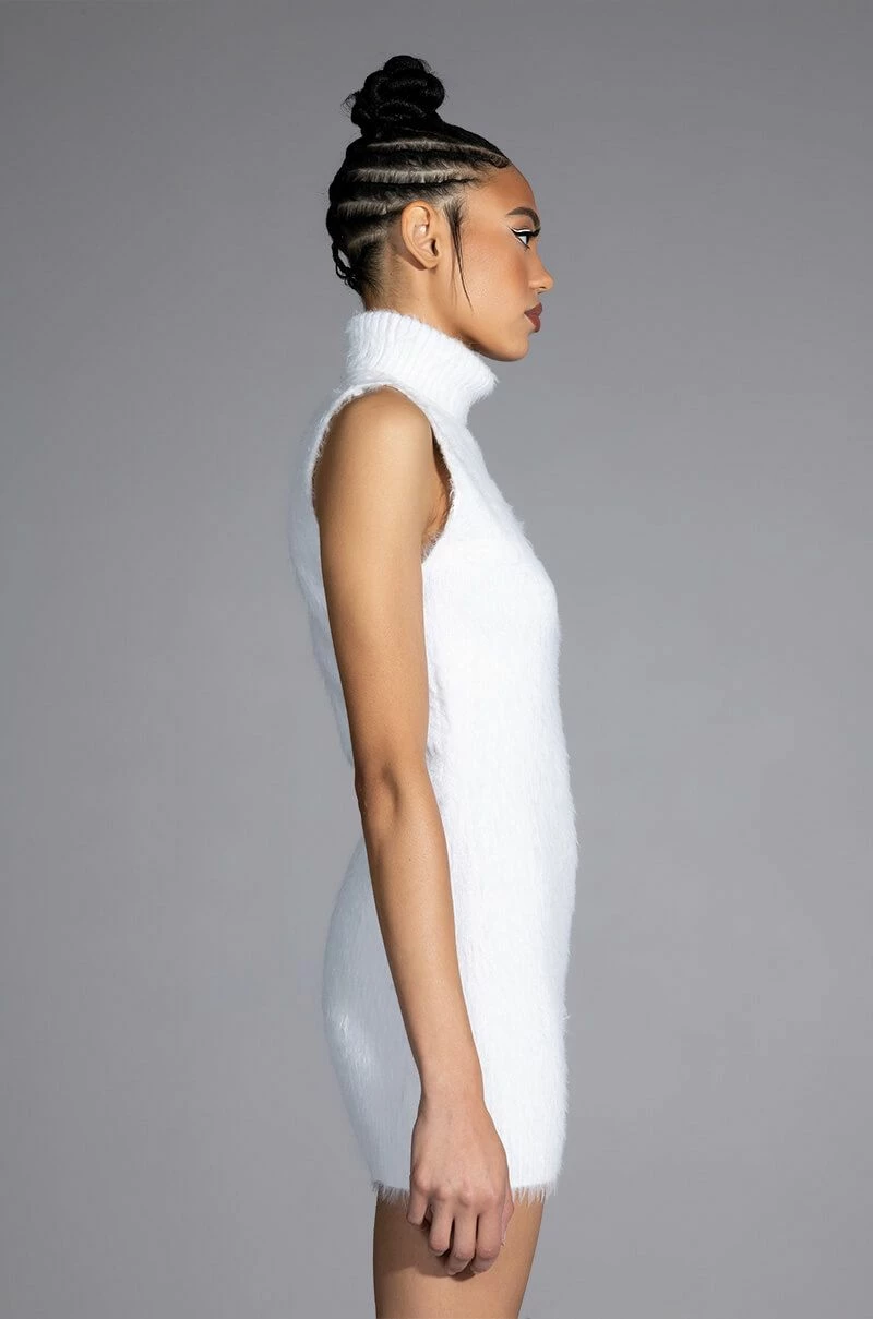 The best basic to dress up or down! The AKIRA Label Kylie Fuzzy Mini Dress is complete with a ribbed turtleneck, sleeveless silhouette, bodycon fit, a mini hem, and a stretchy soft and fuzzy fabrication. Versatile and ready for whatever weather comes your way, warm up when you style this skintight dress with a leather jacket and ankle boots.