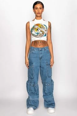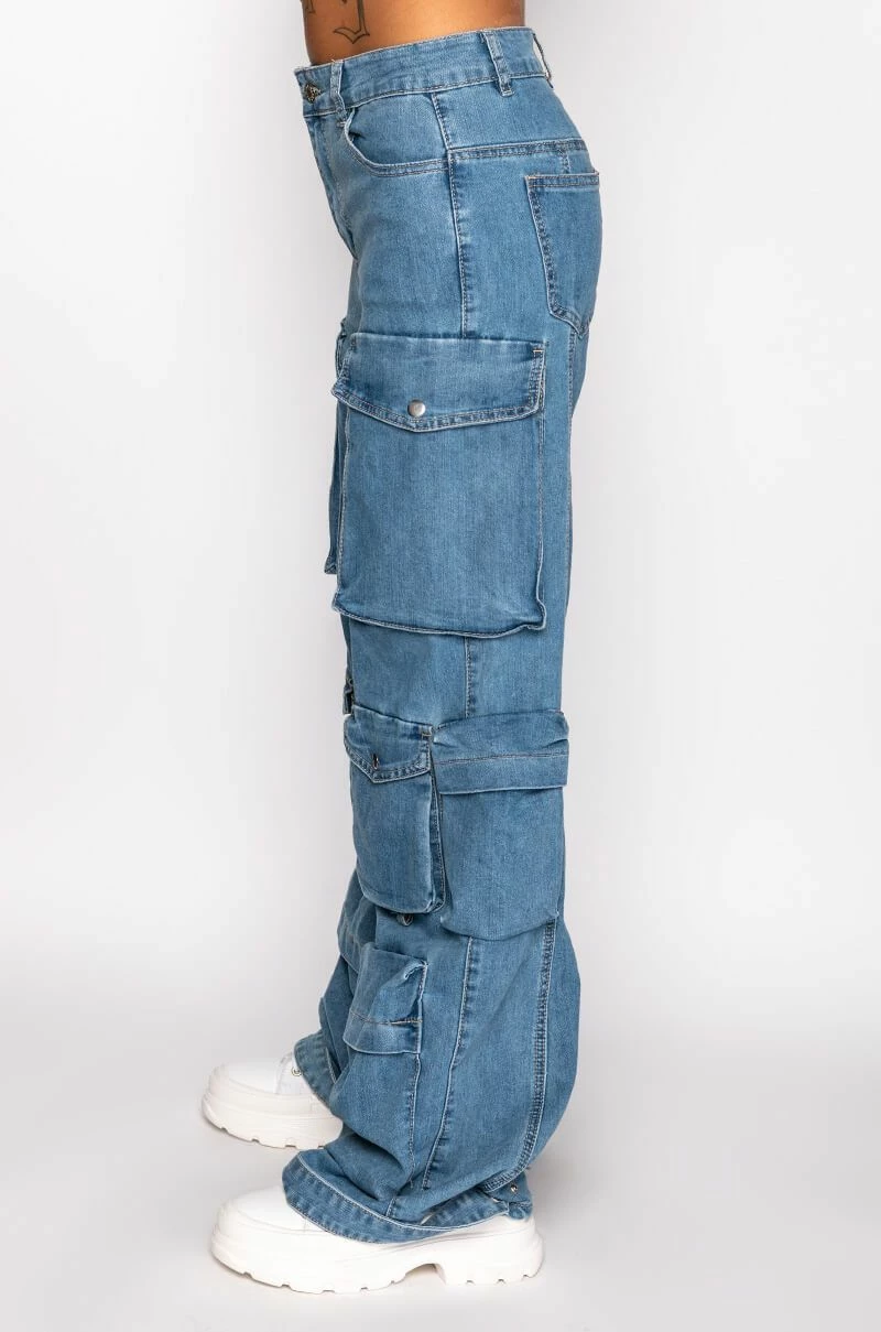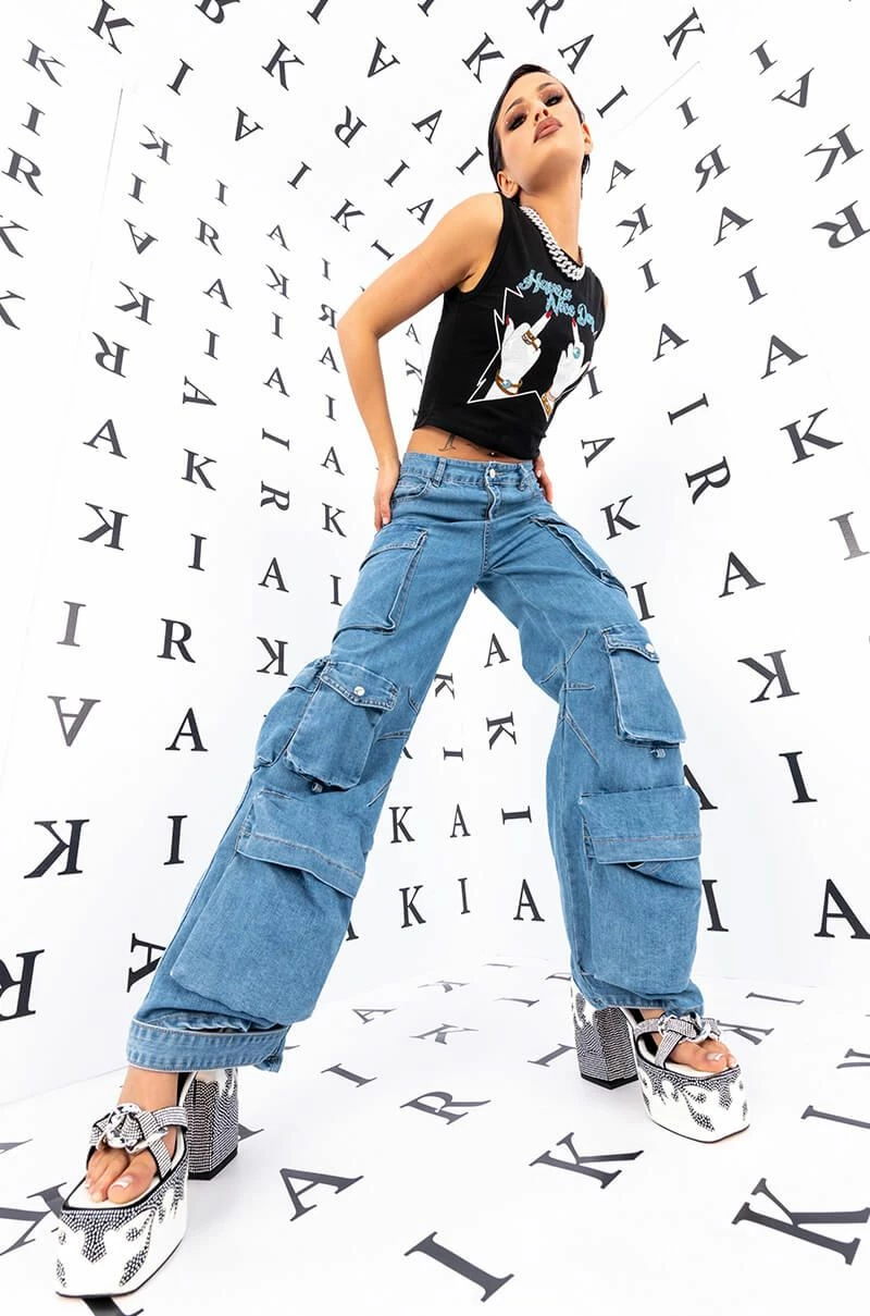 We’re feeling the island vibes in The AKIRA Label La Isla Cargo Jeans! These laid-back bottoms are made from a structured denim fabrication and feature a high rise waist, belt loops, a classic 5-pocket design, large cargo snap button side pockets, a wide leg silhouette, triangular stitching on the inner legs, and denim snap button ankle cinchers. Complete with a classic zip button closure.