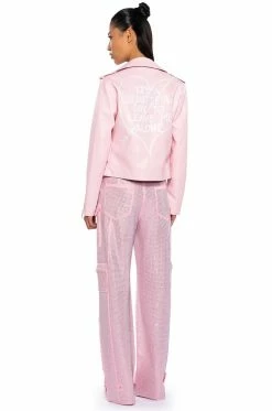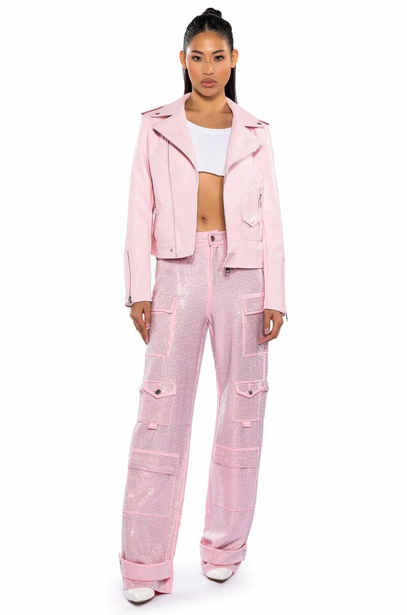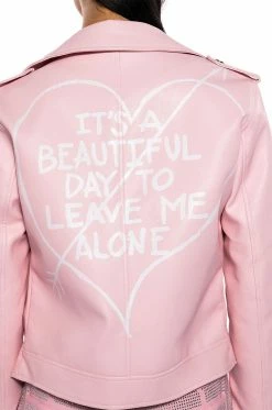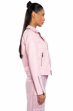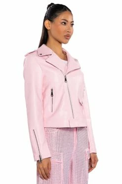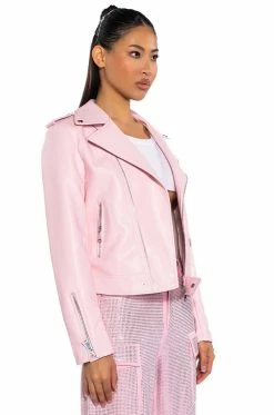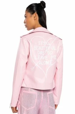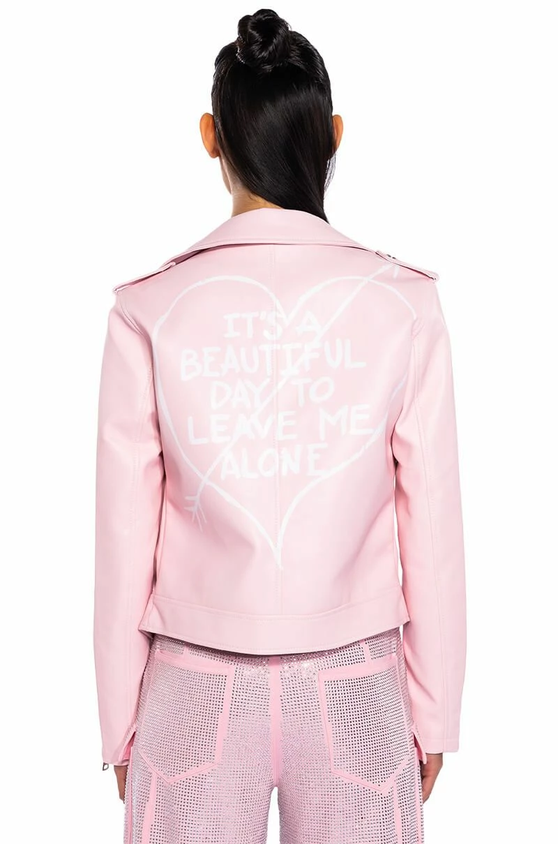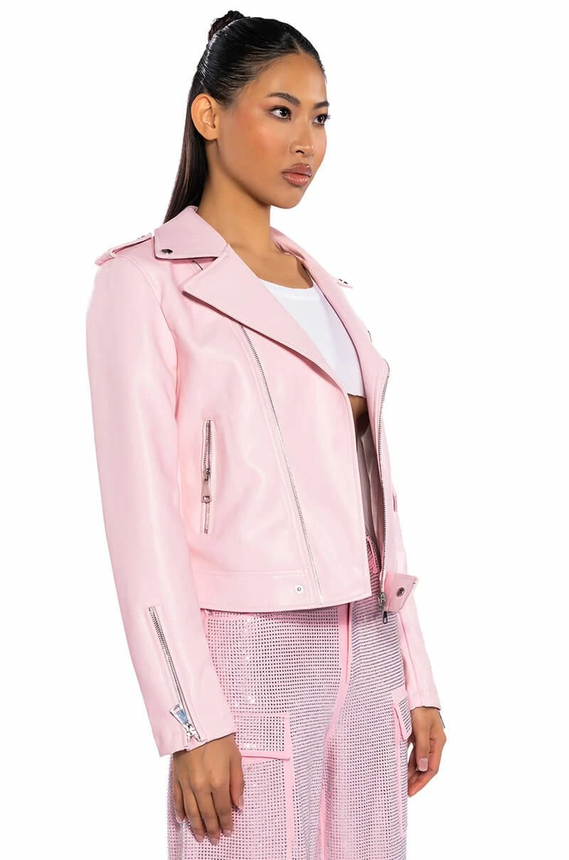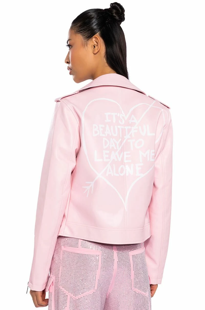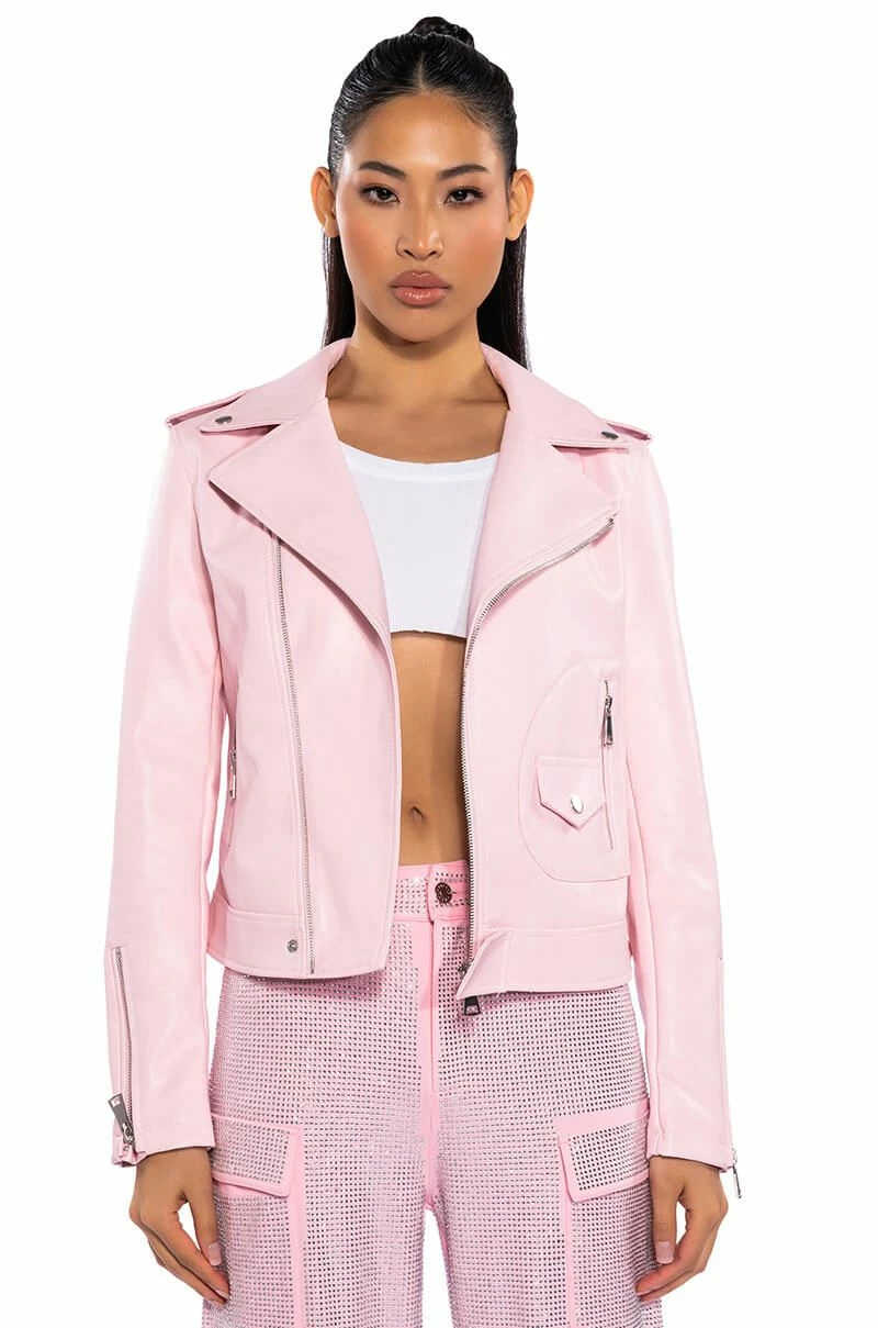 Sometimes you need to roll solo. The AKIRA Label Leave Me Alone Moto Jacket is a vegan leather jacket featuring a studded notch collar, long sleeves with zippered wrists, front zipper pockets, and a full zip front closure. Complete with a smooth and a lightweight polyester lining.