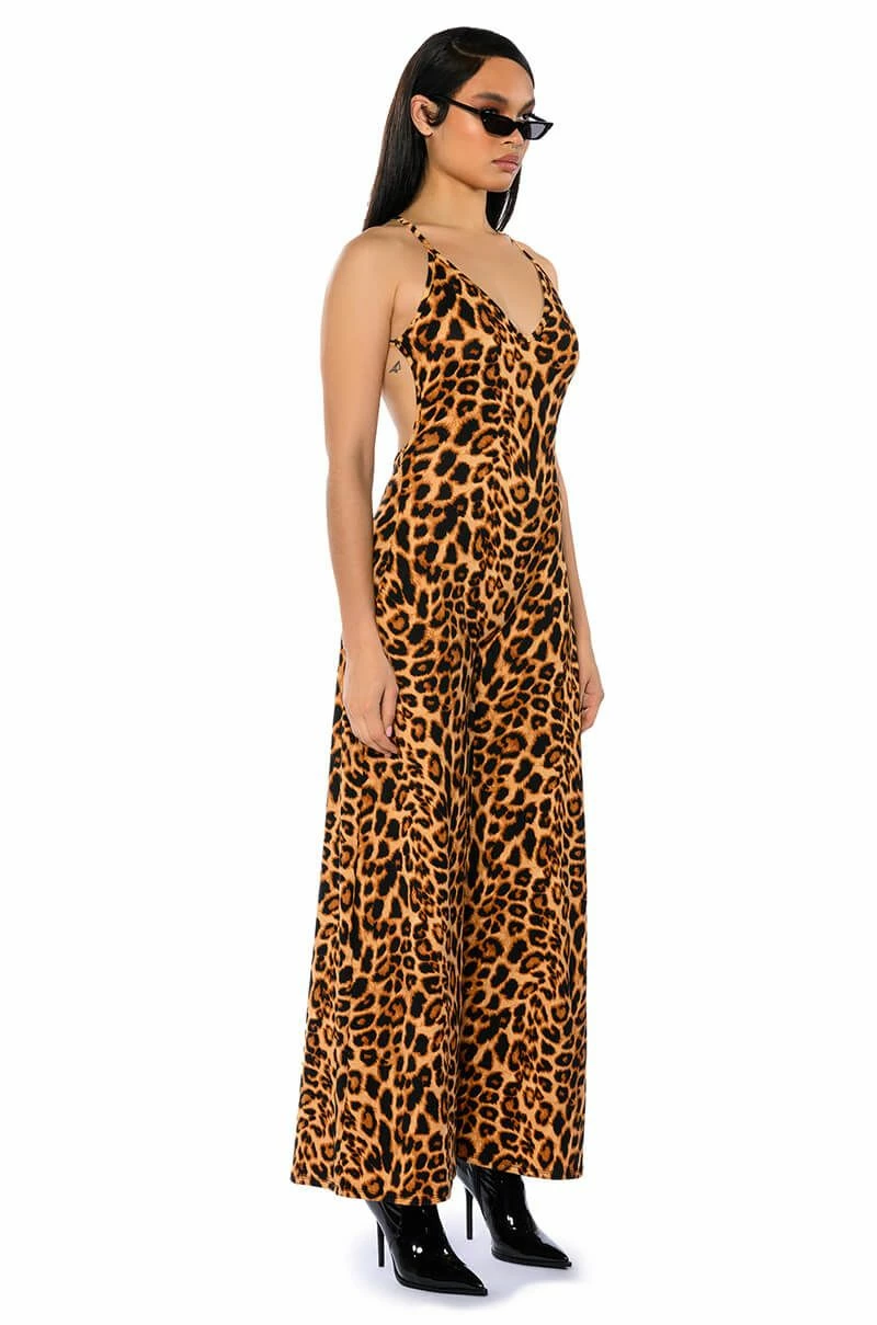 The AKIRA Label Leopard Makes Me Happy Jumpsuit is made from a soft, stretchy fabrication and features a bold, leopard print, cross back tank straps, a V-shaped neckline, and a wide leg silhouette. Complete with a sexy open back with an elastic band, a slip-on fit, and an included leopard print bandana. Style with platform pumps to finish your look.