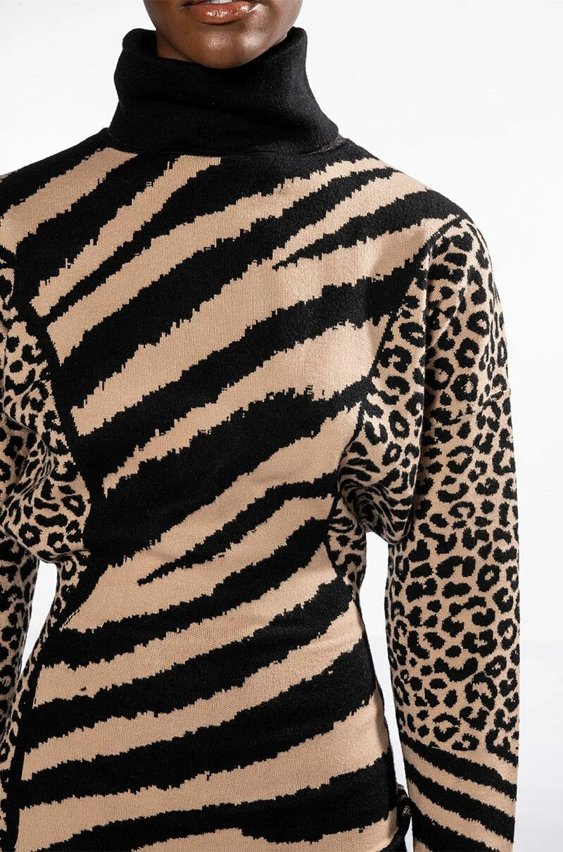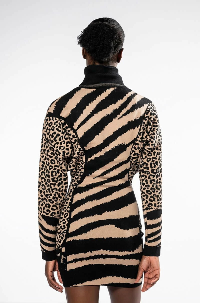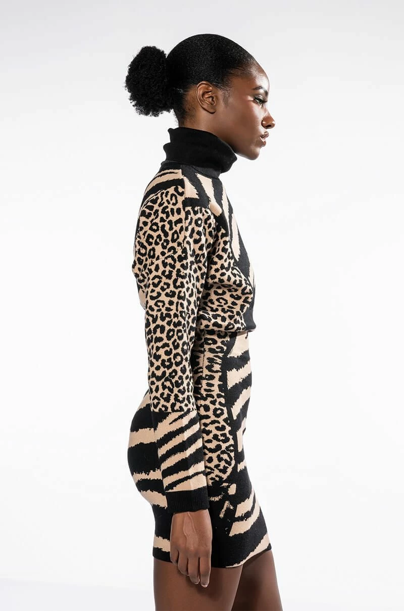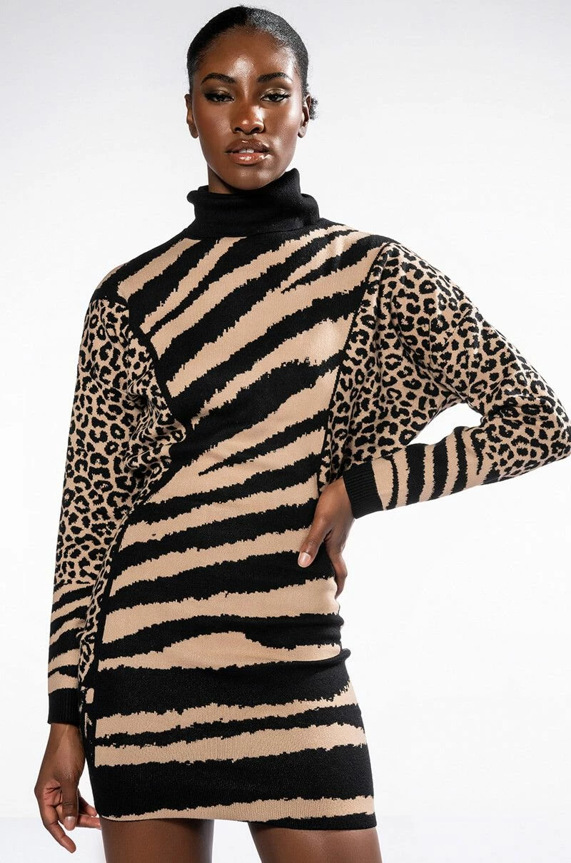 The AKIRA Label Let It Sit Sis Turtleneck Mini Dress features a plush knit fabrication, a fold over turtleneck silhouette, long sleeves, a relaxed sloped shoulder design, a sexy body skimming fit, a mini length, and a slip-on design. Complete with multi-animal print throughout. Pair this piece with thigh high flatform boots to complete your look.