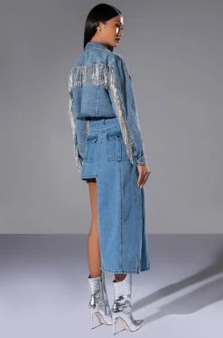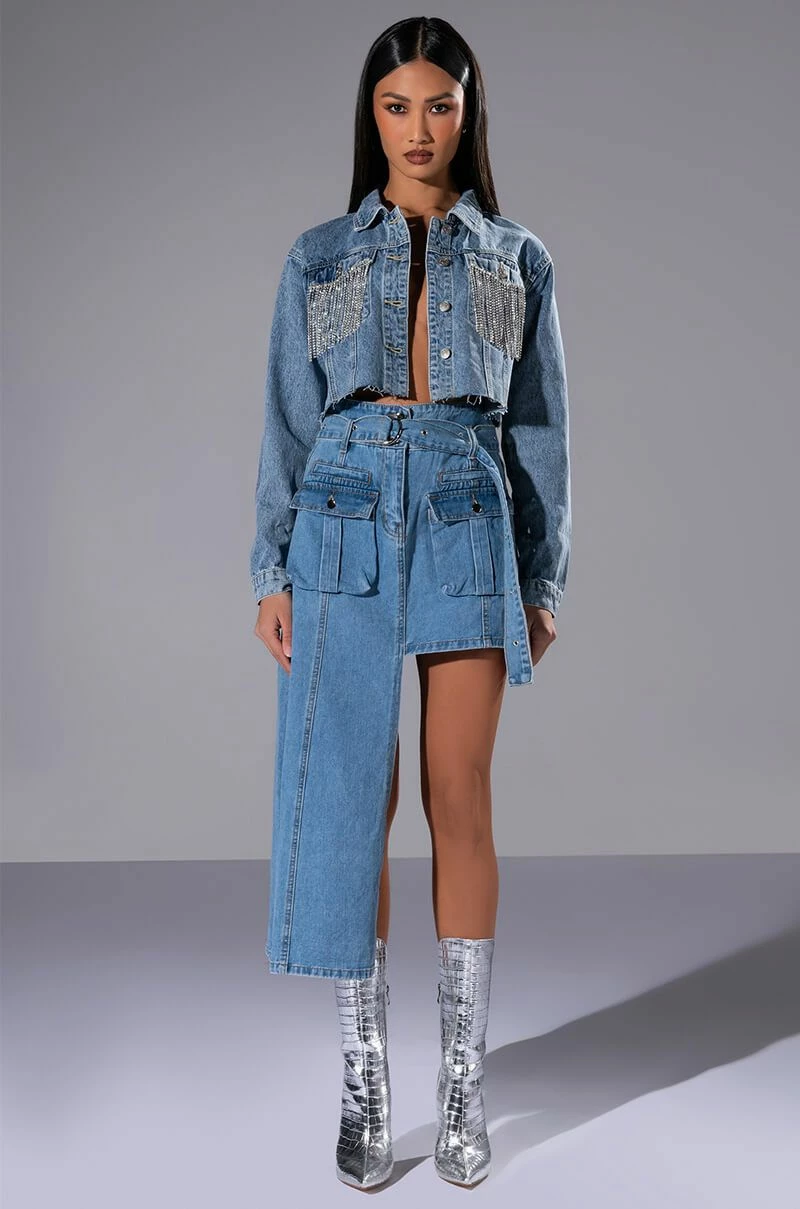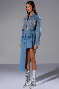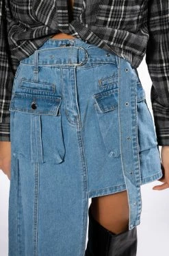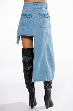 Upgrade your look with the AKIRA Label Level Up One Leg Denim Skirt! This skirt is made from a light blue denim wash, and is complete with a half mini length and half maxi length, four fold over pouch pockets, a wide waistband, three front button and zipper closure. Style this skirt with a bodysuit for a unique look!
