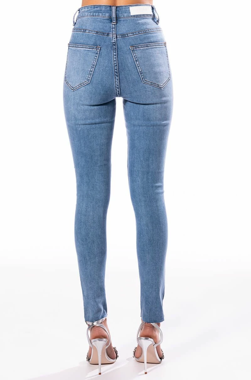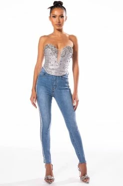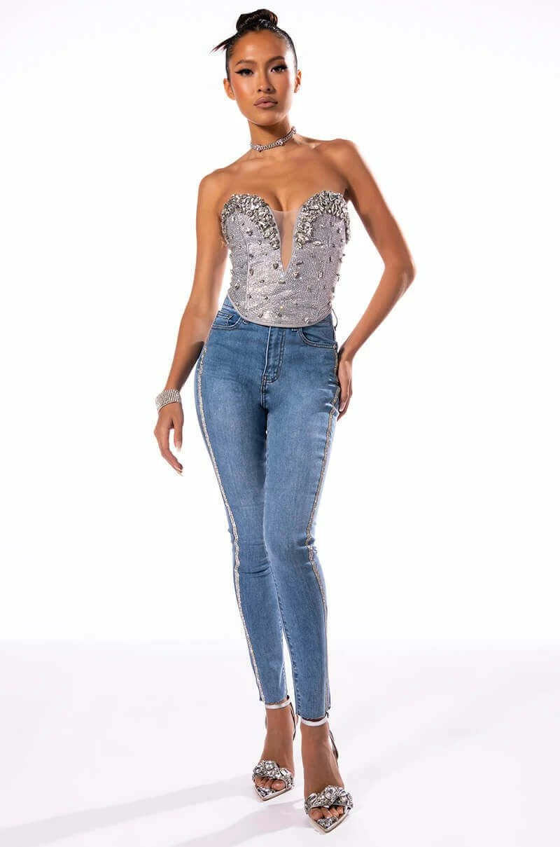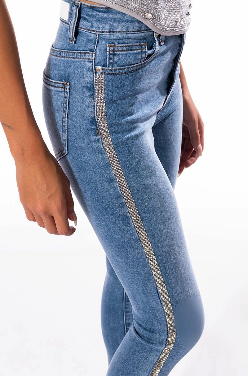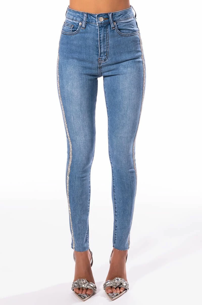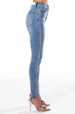 Your life be like… Show ‘em how you shine with The AKIRA Label Life Like This Rhinestone Stripe Skinny Jeans. These denim based beauties feature a stretchy curve hugging composition, flattering high waist rise, five pocket design, zipper fly button fasten, raw cropped ankle hems, and rhinestone trim side seams. Pair with a corset-style top and rhinestone accessories for an aspirational look.