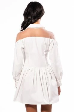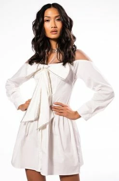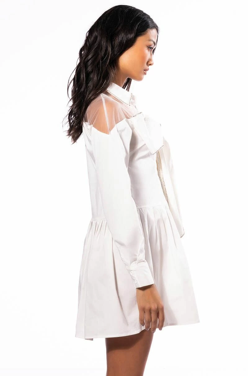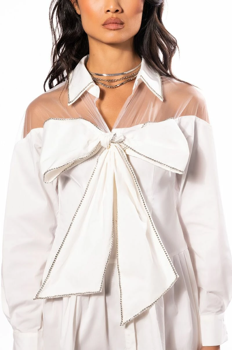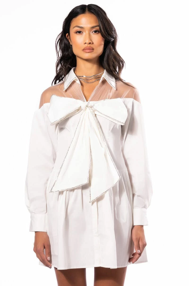 The AKIRA Label Like A Present Bow Rhinestone Shirt Dress is made from a classic cotton fabrication, and features tulle fabrication along the shoulders and back. The dress also features rhinestones embellishing along the collar and front bow tie, and a front button up closure.