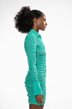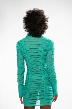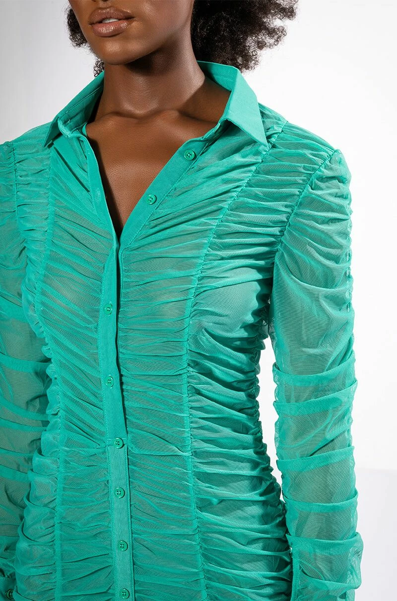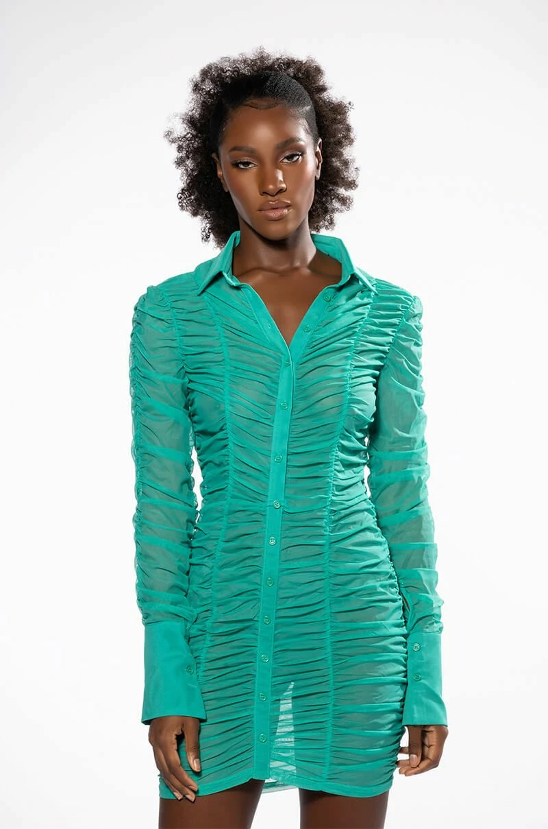 The AKIRA Label Limelight Textured Long Sleeve Dress features a sheer mesh base, all-over ruched detailing, a fold over collared neckline, a mini length, and long button cuff sleeves. Complete with a button down front placket.