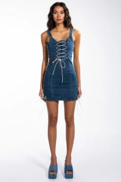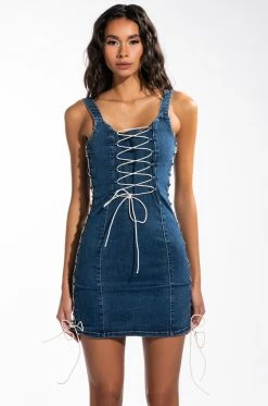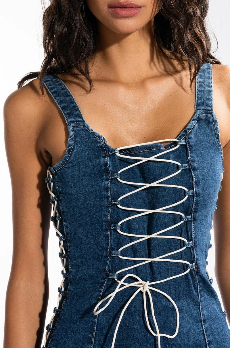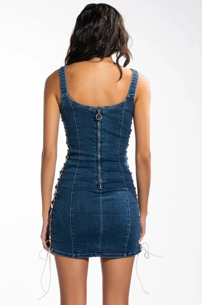 The AKIRA Label Little Lace Up Flexfit Denim Mini Dress is made from medium blue denim fabrication, and is complete with a scoop neckline with wide tank straps, contrast lace up detailing along the sides and chest, a mini length, and a back zipper closure.