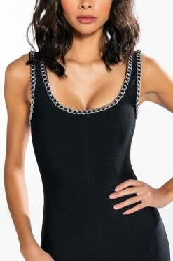 Looking so good we had to say it twice. The AKIRA Label Looking Right Right Bandage Mini Dress is made from a curve-hugging bandage fabrication and features wide tank straps, a rounded neckline, chunky chain trim detailing along the neckline and straps, a mini length, a sexy bodycon fit, an asymmetrical hem, and a tonal back zipper closure.