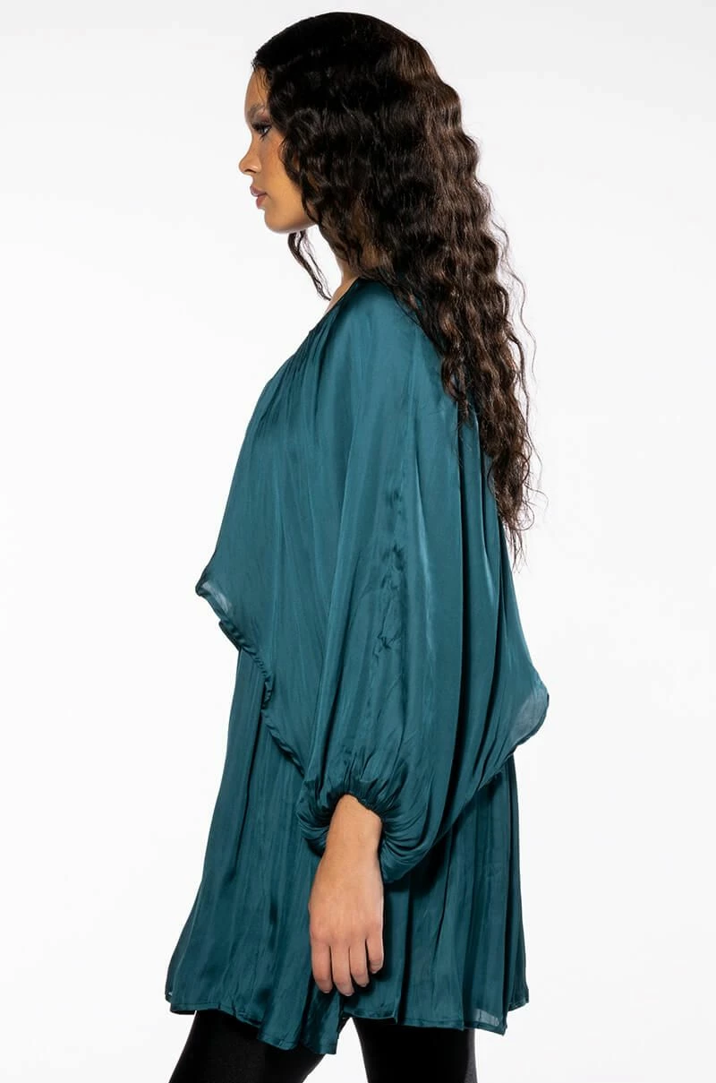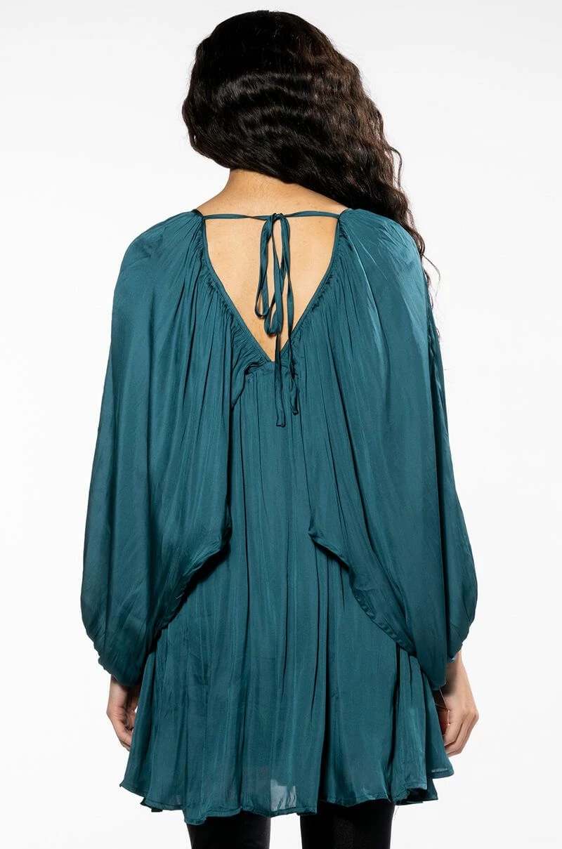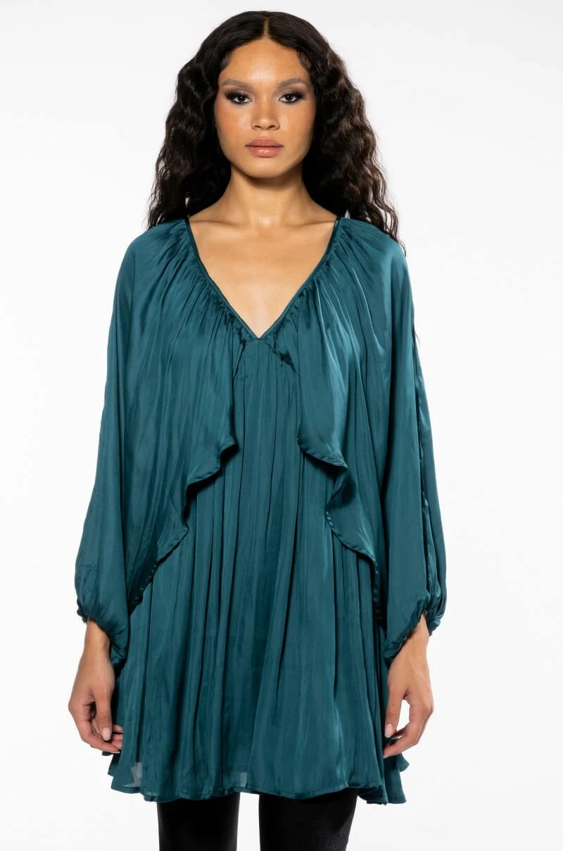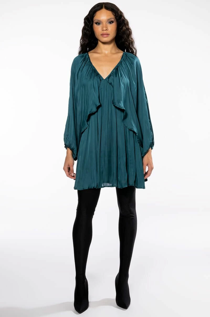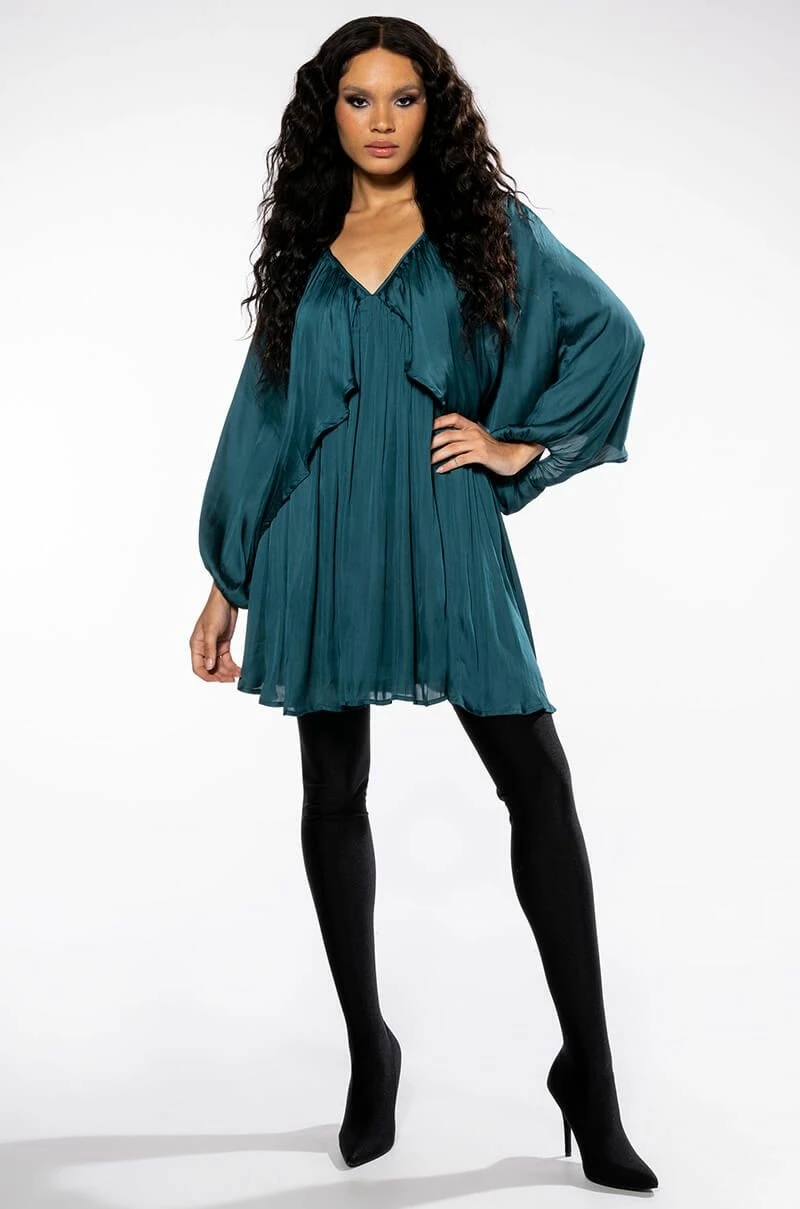 Make a day of it with The AKIRA Label Lovely Day Long Sleeve Mini Flare Dress. This effortlessly chic piece features a pleated, lightweight satin fabrication, a v-neckline, long, breezy open dolman sleeves, a trapeze silhouette, and a mini length silhouette. Complete with a pull on fit and an empire waist bodice.