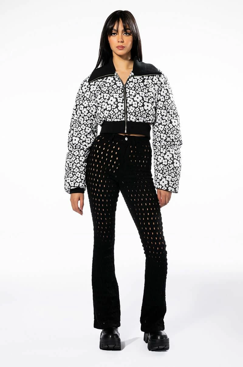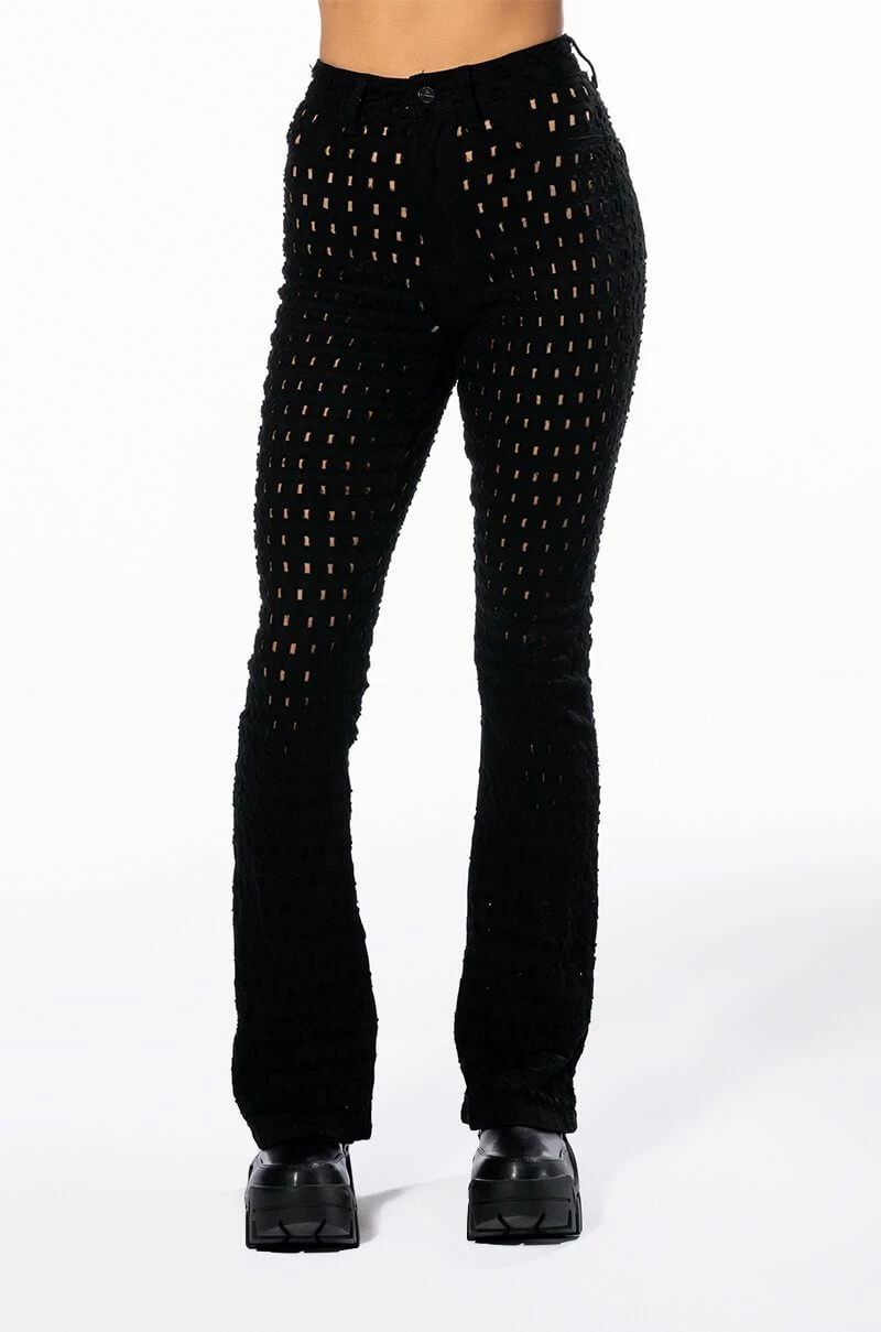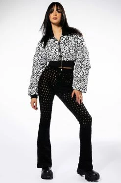 Gotta craving for sexy denim? Time to snag The AKIRA Label Make You Want More Distressed Flare Jeans. These stretchy flare pants feature a high waist rise, a zipper fly button fasten, a curve hugging fit, working back pockets, wide flare hems, and all-over distressed hole detailing. Pair with your favorite sleek turtleneck and patent ankle booties to complete the look.