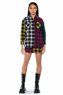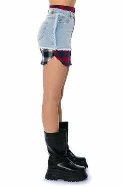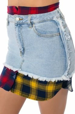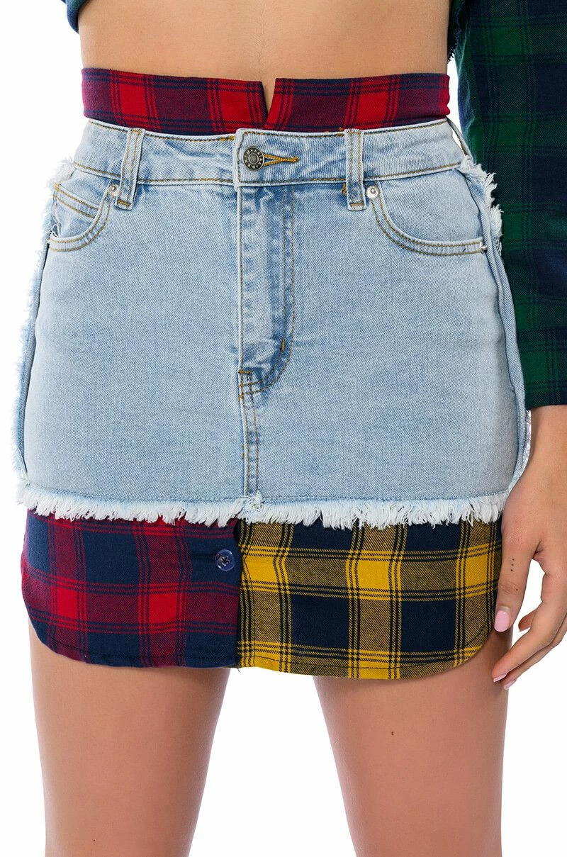 Autumn ready, The AKIRA Label Marianna Plaid Detailed Mini Skirt is made from a washed denim fabrication base and features a high rise waist, working belt loops, a five-pocket design, distressed trim detailing, a mini length silhouette and colorblock flannel shirt paneling along the waist and hem. Complete with a button and zipper front closure. Pair this piece with the coordinating AKIRA Label Marianna Multi Colored Plaid Shirt to complete your look.