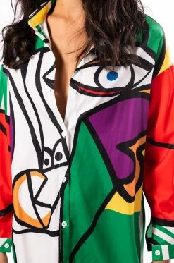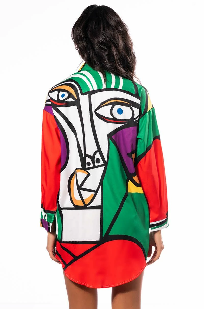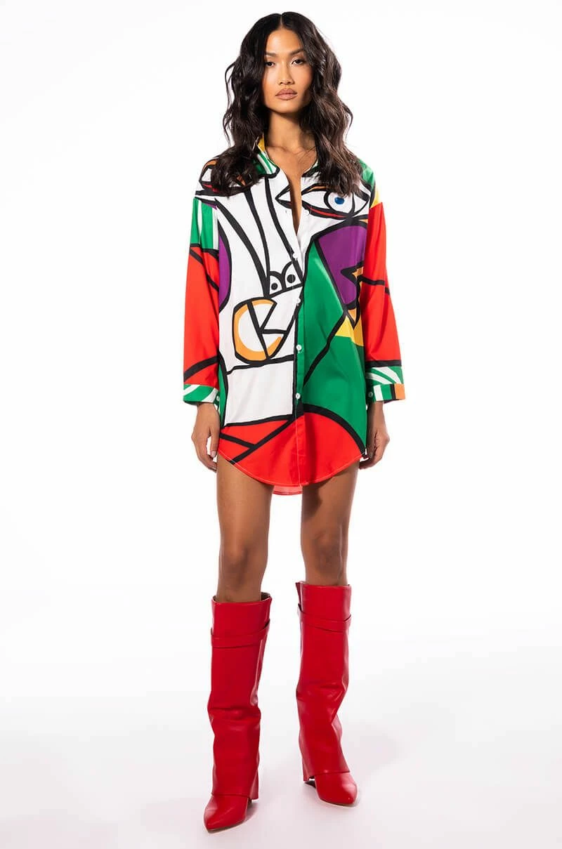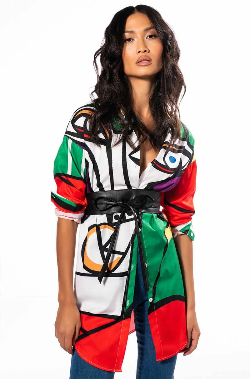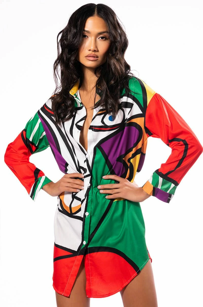 You’re a work of art, sis. The AKIRA Label Masterpiece Button Down Mini Dress features a smooth, lightweight shirting fabrication, a bold abstract art multicolor print, a collared neckline, long sleeves, button cuff details, a mini length, a rounded drawstring hem, and a button up front closure. Layer this punchy piece over thigh high boots for a complete look.