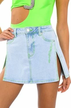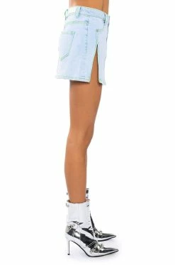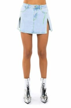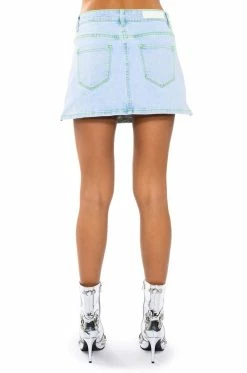 The AKIRA Label Mia Double Slit Micro Mini Denim Skirt is made from a washed denim fabrication and features a high rise waist, working belt loops, slant side pockets, contrast colored seam details, and a micro mini silhouette. Complete with two front slits and a buttoned zipper front closure. Pair with a bodysuit top and thigh-high boots for an effortless look.