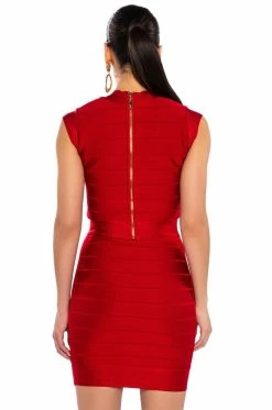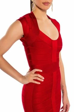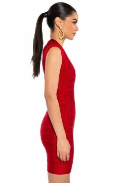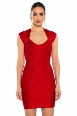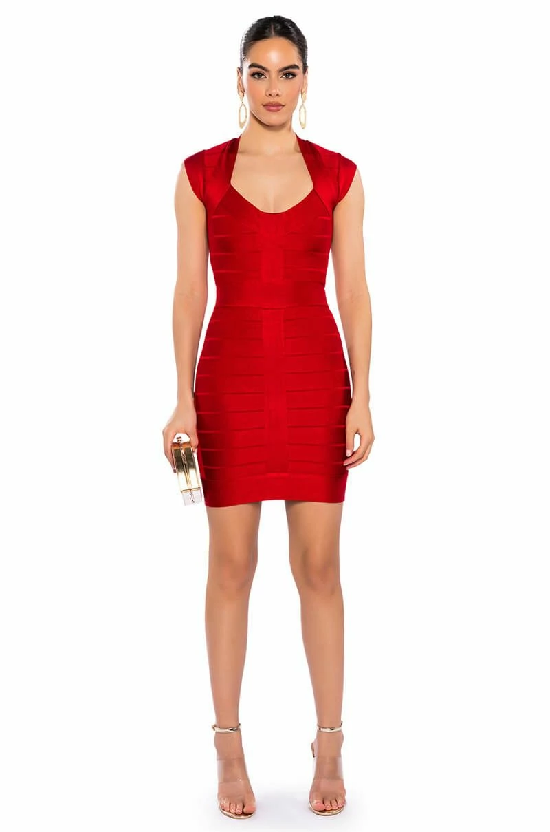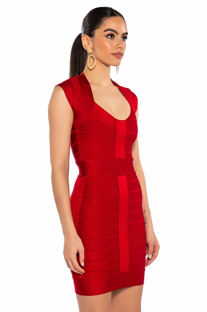 The AKIRA Label Mila Cap Sleeve Soft Bandage Mini Dress is made from a glossy bandage fabrication and features striped bandage detailing, a plunging neckline, cap sleeves, a sexy bodycon fit, and a mini length silhouette. Complete with an exposed back zipper closure.
