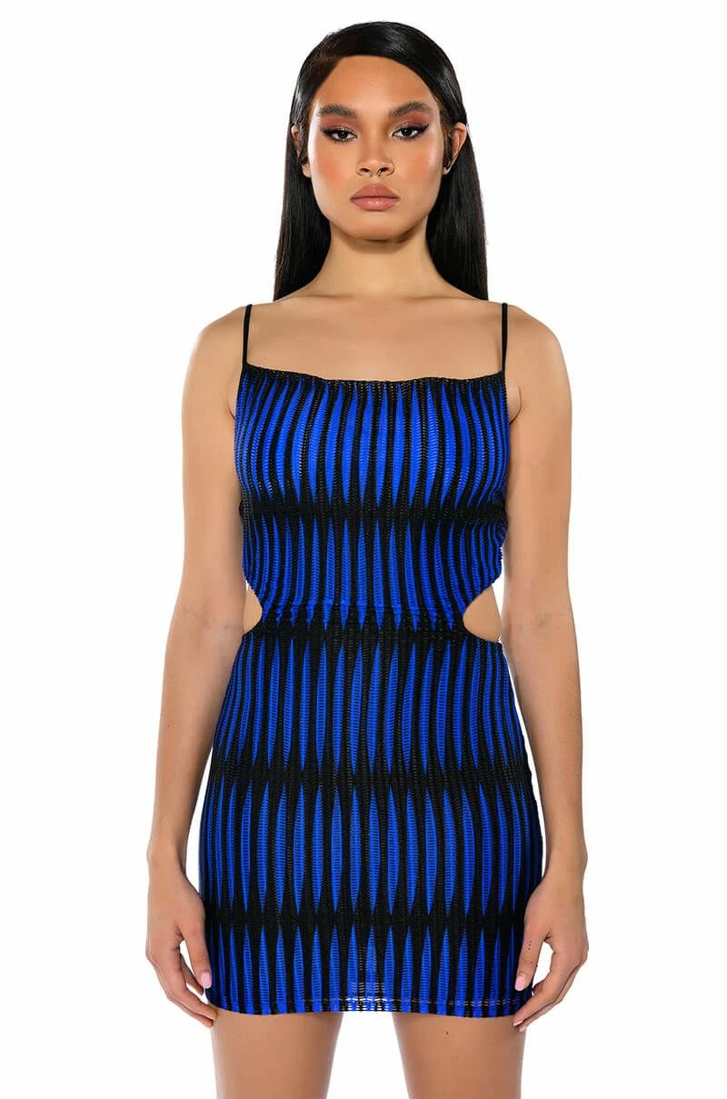 Fly away with The AKIRA Label Neverland Textured Mini Dress! This party-ready dress is made from a sheer fabrication and features chevron print patterning, adjustable spaghetti straps, a cowl neckline, a sexy bodycon fit, an open back with tie detail, a mini length silhouette, polyester lining, and a slip-on fit. Pair this piece with platform boots and a cropped moto to complete your look.