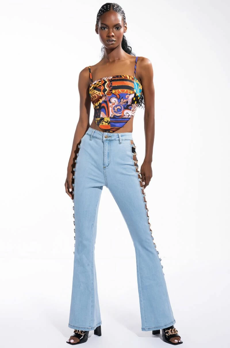 Step to the beat of your own vibrations with The AKIRA Label New Sensation Chain Detail High Waisted Flare Jeans. These stretch denim pants feature cut out side detailing, chunky chain link accents, a high rise waist, and a retro flare leg silhouette. Complete with working belt loops, back pockets, and a button up and zipper closure. Pair with a cute cropped halter, and slay the day away.