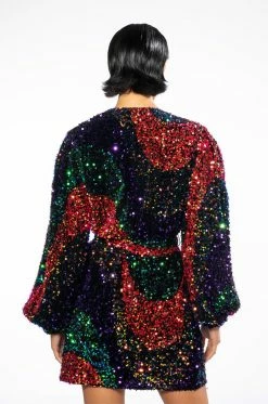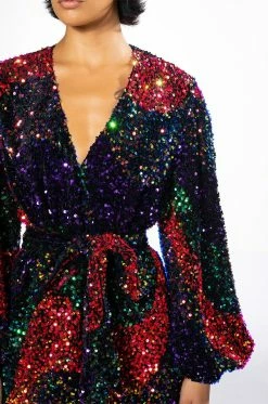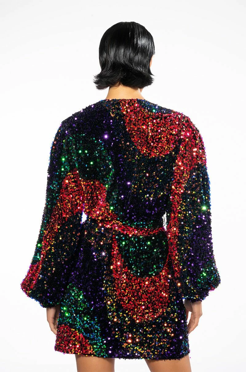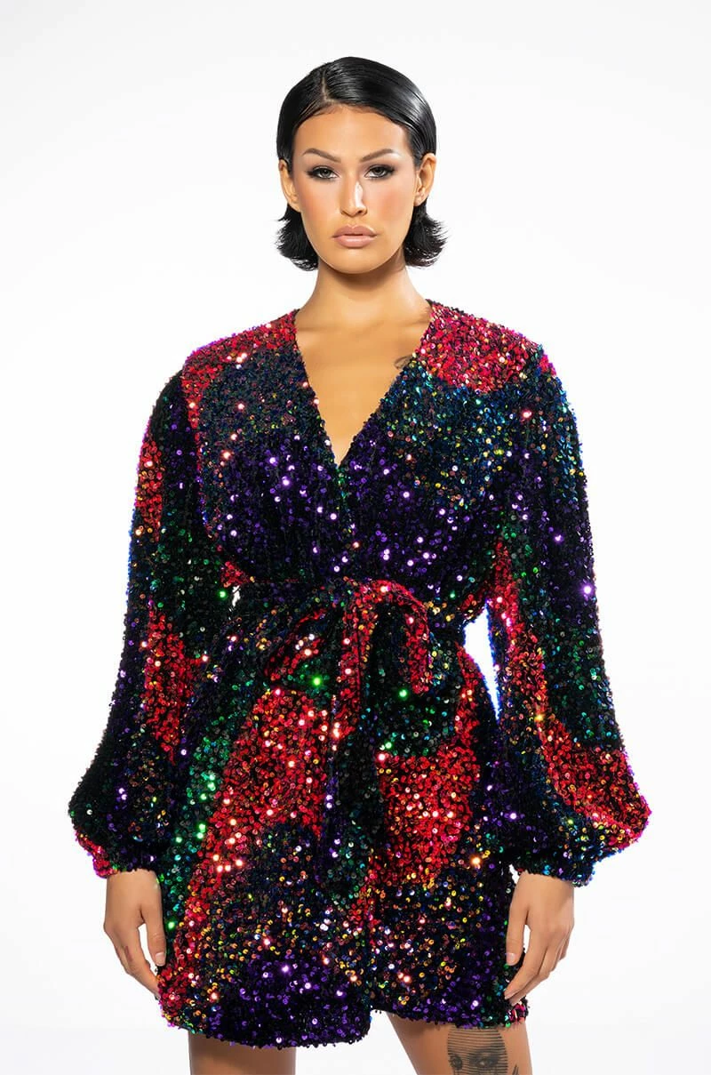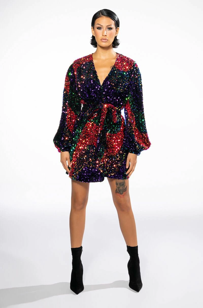 The On My Time Sequin Wrap Mini Dress is made from a velvety fabrication base and features colorful sequin body detailing, a plunging neckline, long sleeves with elastic cuffs, a mini length silhouette, polyester lining, functioning belt loops, and a coordinating sequin-detailed wrap front tie closure. This cardigan-like style is sure to keep you cozy and cute.