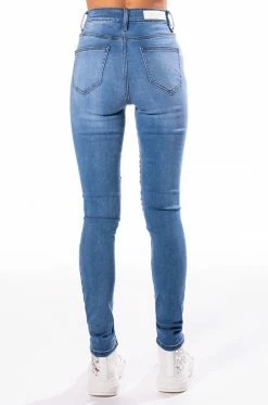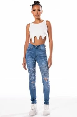 The AKIRA Label Outta This World Rhinestone High Rise Skinny Jeans features a high waist rise, lived-in stone wash, five pocket design, zipper fly button fasten, slight distressing on the knees, and chunky rhinestone and pearl trim detailing. Pair these figure flattering pants with a flowy blouse and square toe sandals.