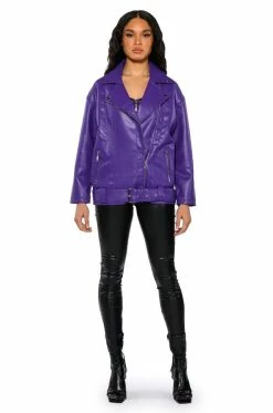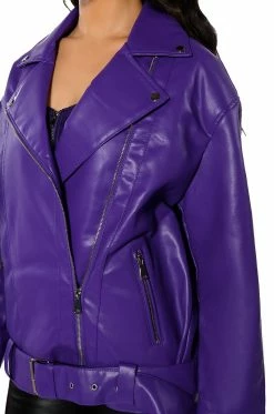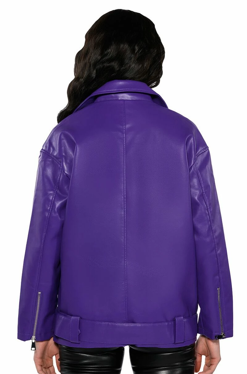 The AKIRA Label Oversized Saturated Purple Moto Jacket is a goes-with-everything staple piece featuring a structured vegan leather fabrication, a classic foldover notch collar, slant side zipper pockets, long sleeves with zippered cuffs, and a satiny inner lining. Complete with a buckle front belted accent, a boxy, oversized cut, and an asymmetrical zippered front closure. Style with distressed denim and your favorite stiletto bootie for a chic everyday look.