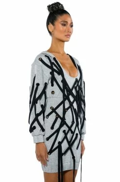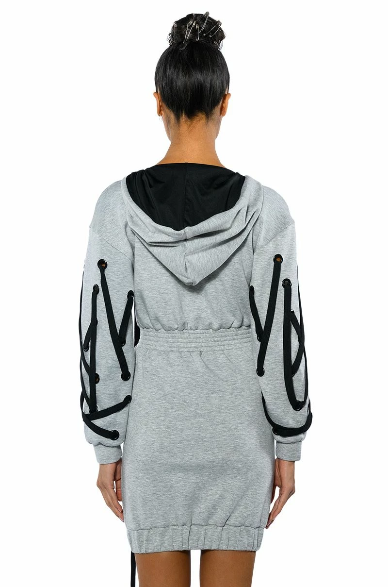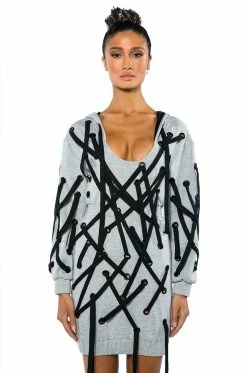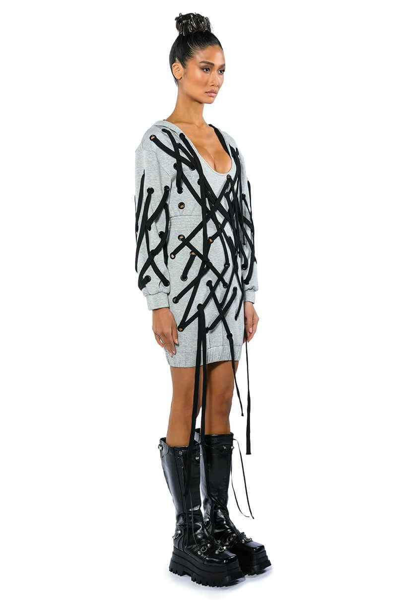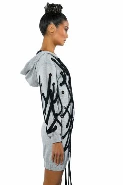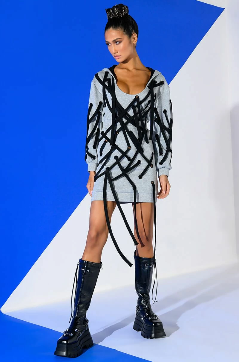The AKIRA Label Parker String Detail Sweatshirt Mini Dress is made from a cozy sweatshirt fabrication and features an attached hood, a rounded neckline, long sleeves with elastic cuffs, a shirred elastic waistband, a mini length silhouette, an elastic hem, and a pull-on design. Complete with grommet and laced shoelace string detailing throughout.