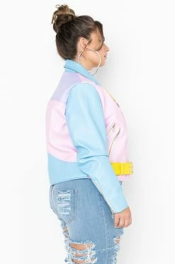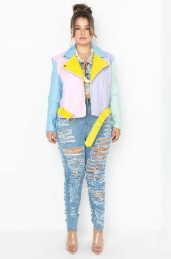 The AZALEA WANG Plus Pastel Dreams Moto Jacket is a sweet color blocked jacket featuring a notched lapel, long sleeves with zips at the cuffs, a front zip, slant side zip pockets, silver hardware, and snap details. Complete with a waist length silhouette. a waist belt, and faux leather fabrication. Layer this jacket over anything basic to add visual interest to a casual ensemble.