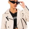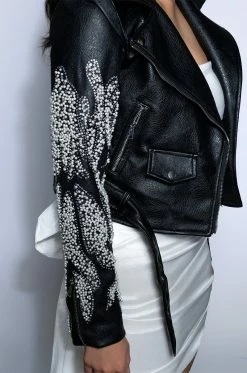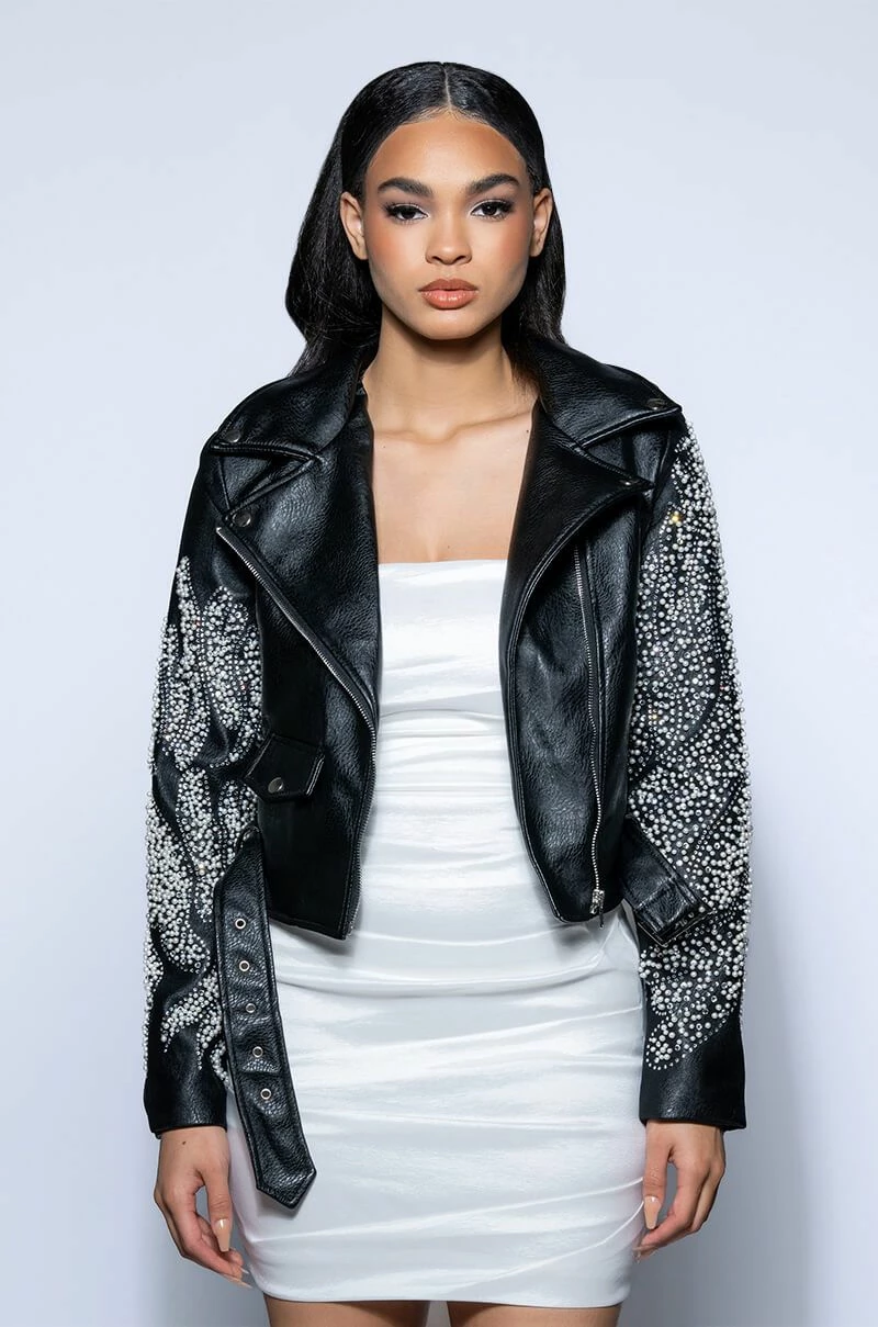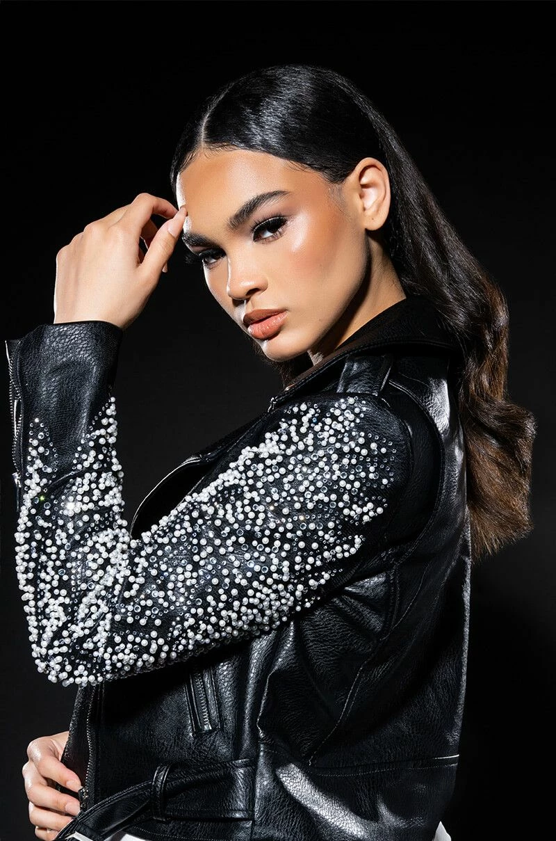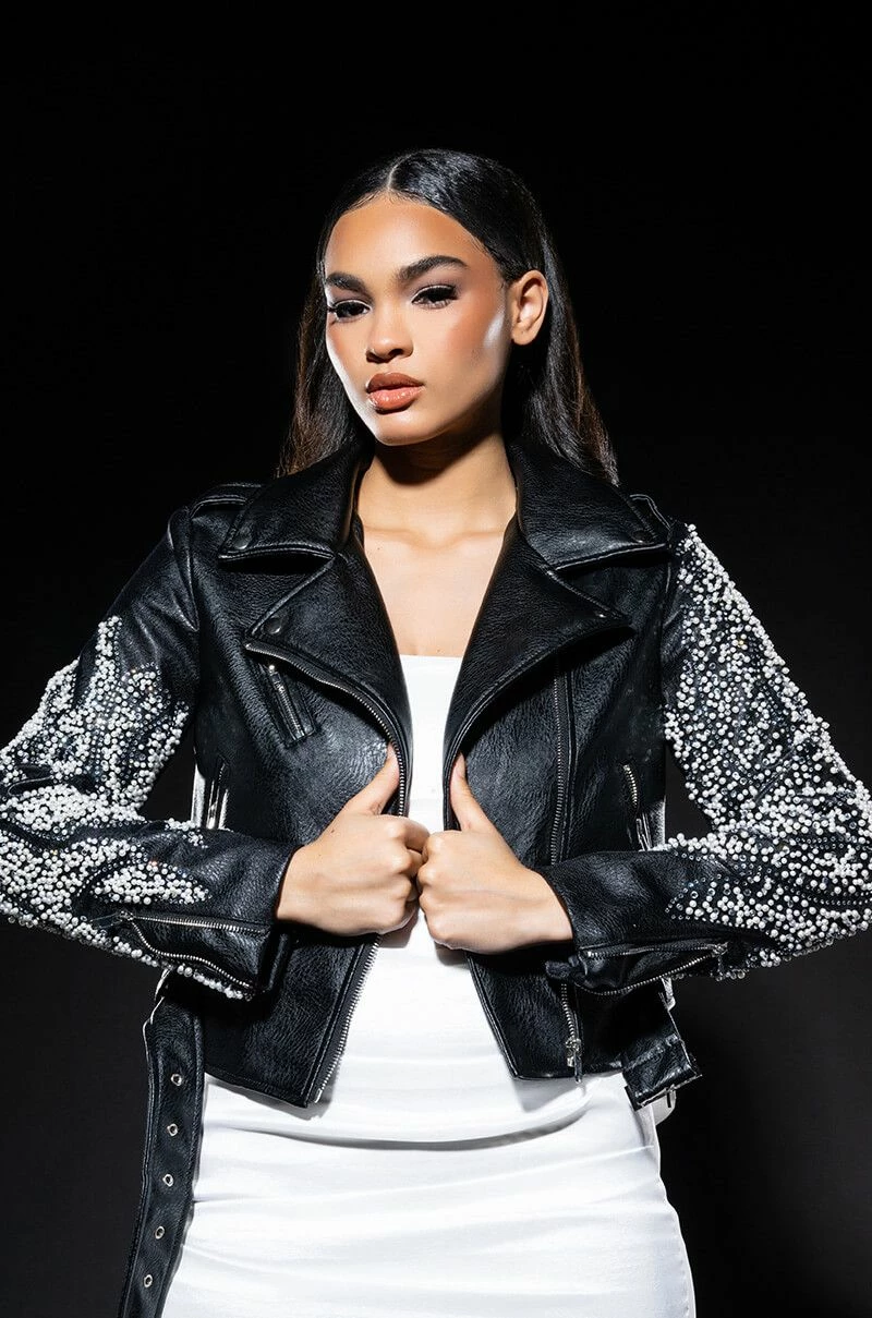 The Akira Label Pearl Shells Arm Embellished Moto features a structured faux leather fabrication, a fold over collar, a mesh covering on the arms with three dimensional pearl and studded accents, and a satin inner lining. The cropped design is complete with zipper and snap button pockets, zipper wrist details, a zip-up front closure, and an accompanying belt at the hem.