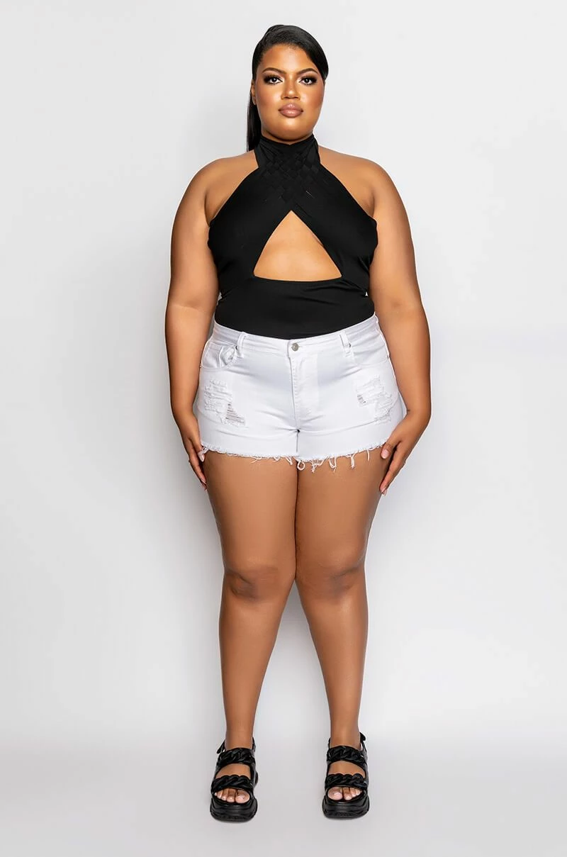 Live the good life in The AKIRA Label Plus Bella Vita Distressed Denim Short! These super stretchy shorts are made from a distressed denim fabrication and feature a high rise waistline, belt loops, a classic five-pocket design, a frayed hemline, and a button and zipper closure.