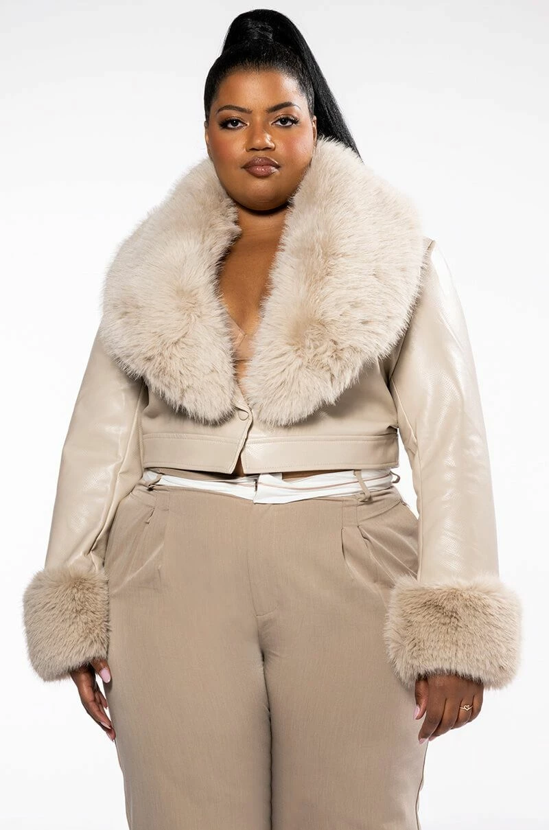 The PLUS AKIRA Label Gisele Crop Moto Blazer features a croc-embossed faux leather fabrication, removable faux fur trim on the fold-over collar (complete with concealed button loop closures) and wrists, and a single snap button closure complete with a cropped cut and long sleeves. Wear this piece on a night out with stiletto booties and skinny pants.