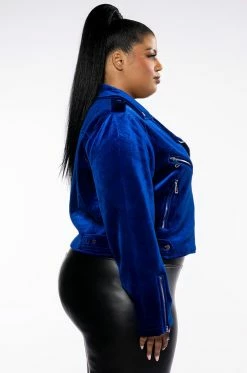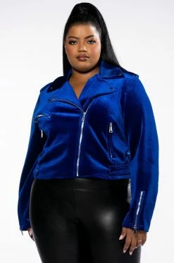 The AKIRA Label Plus Velvet Noir Moto Jacket features a luxe velvet fabrication, silver hardware, a notched lapel, shoulder epaulets, a front zip, zip front pockets, and zips at the wrists. Style with pleather pants and ankle booties.