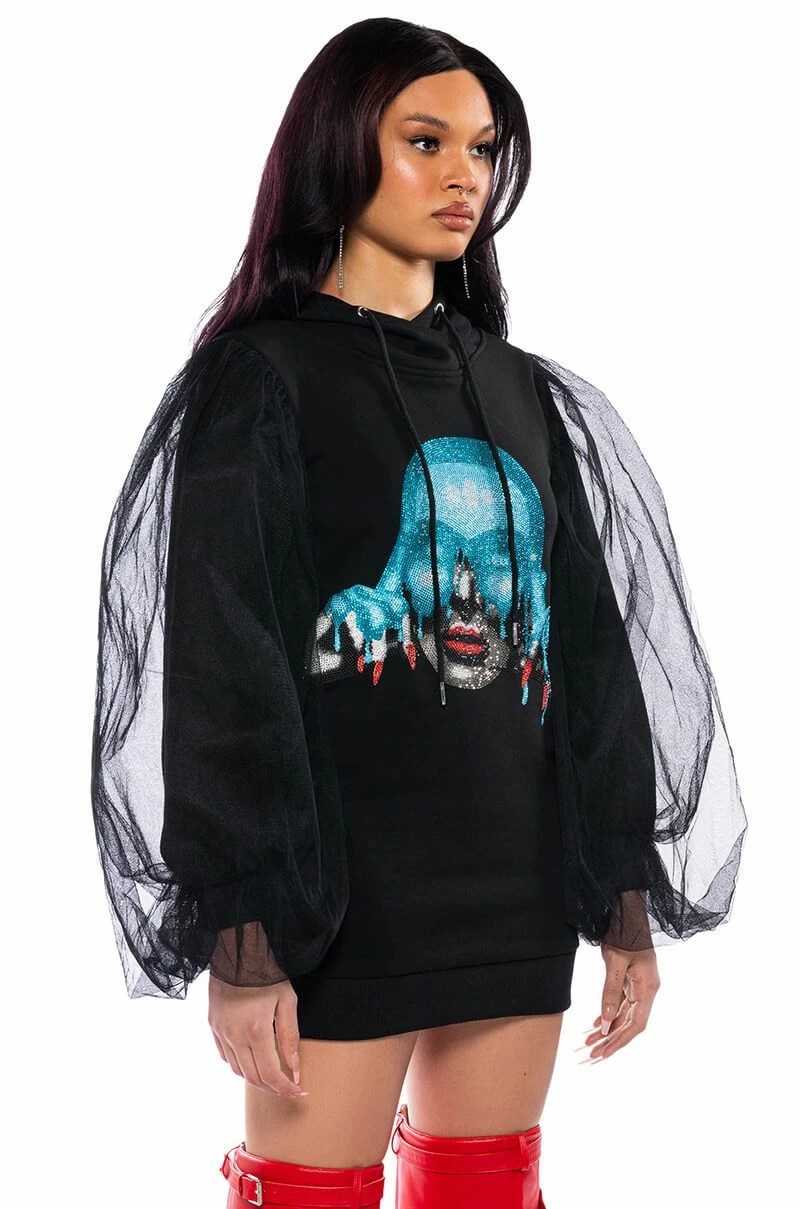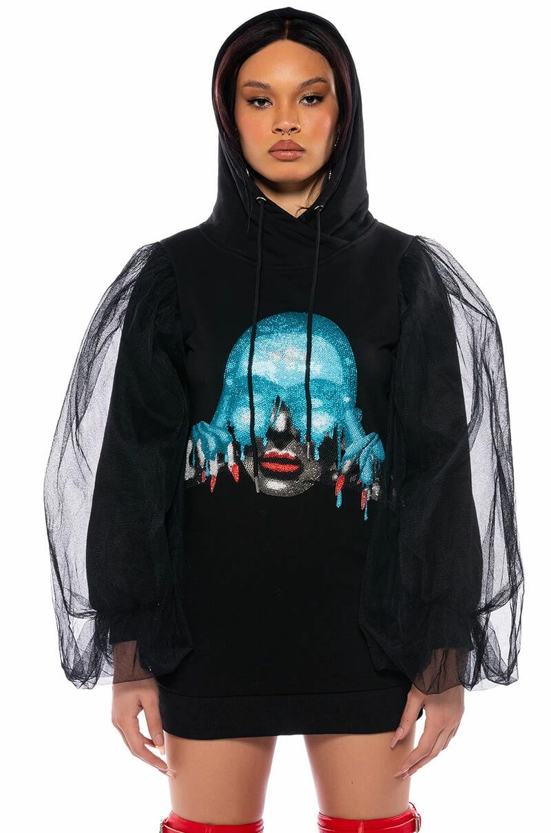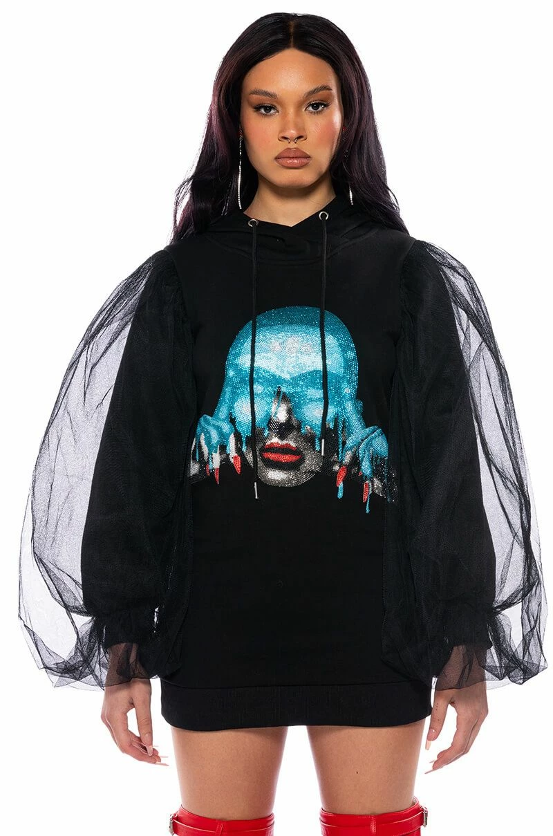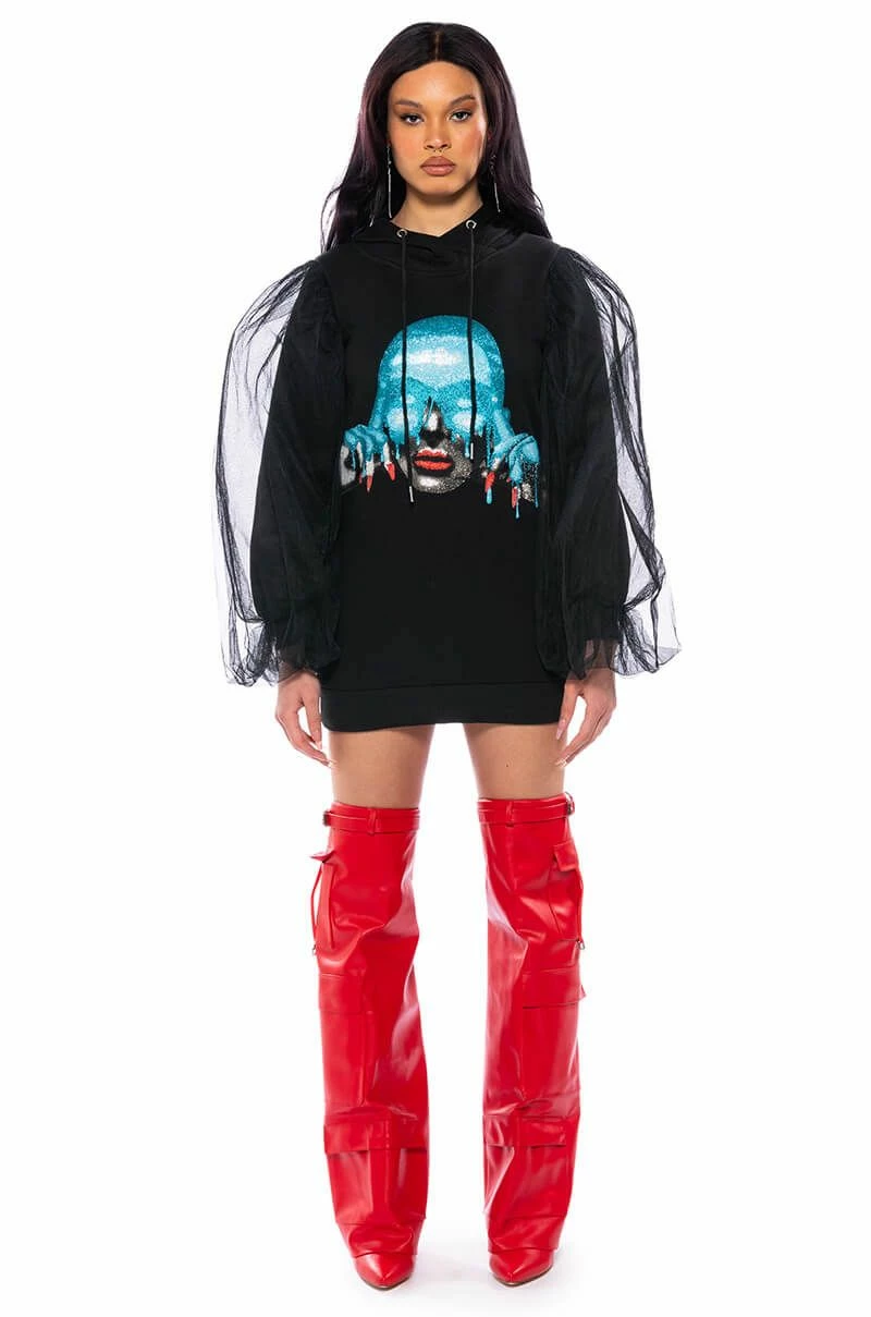 The AKIRA Label Read My Mind Sweatshirt Dress is made from a classic sweatshirt fabrication and features an attached drawstring hood, long sleeves with a puffy mesh top layer and ribbed knit cuffs, a rhinestone-detailed melting silhouette graphic with bold lips and nails, a boxy fit, a mini length silhouette, and a ribbed knit hem. Pair this piece with slick pant boots to complete your look.