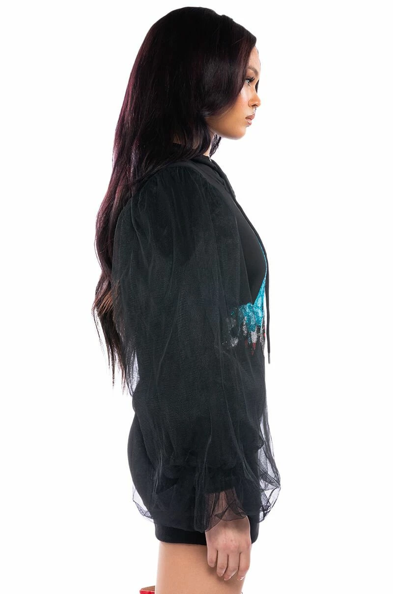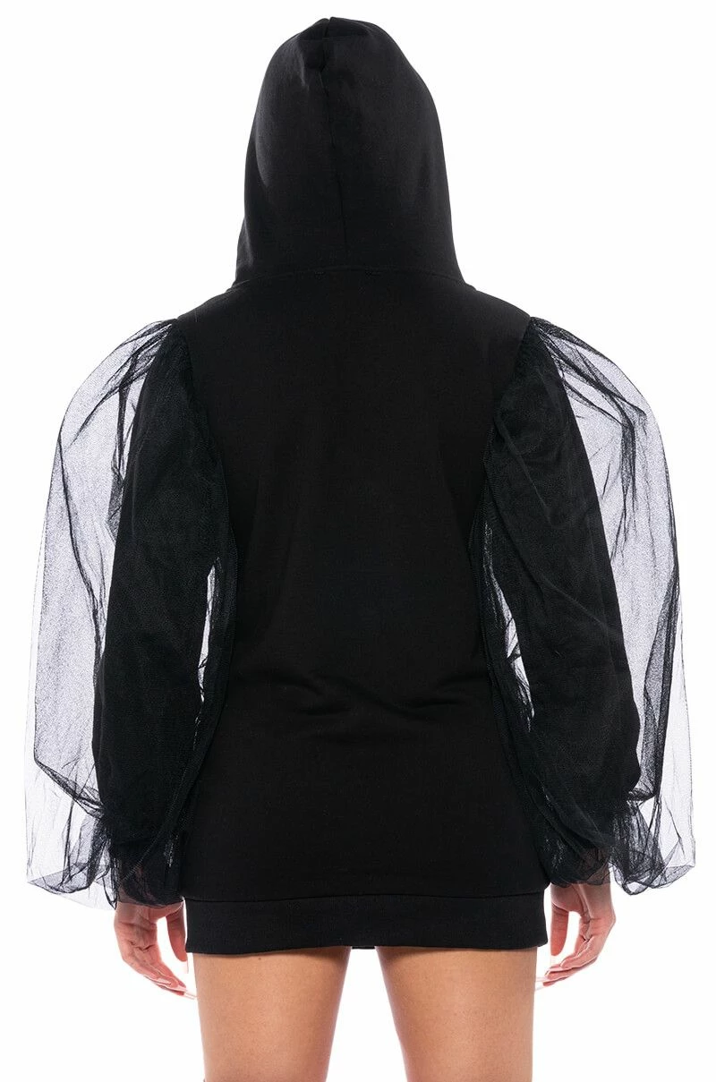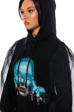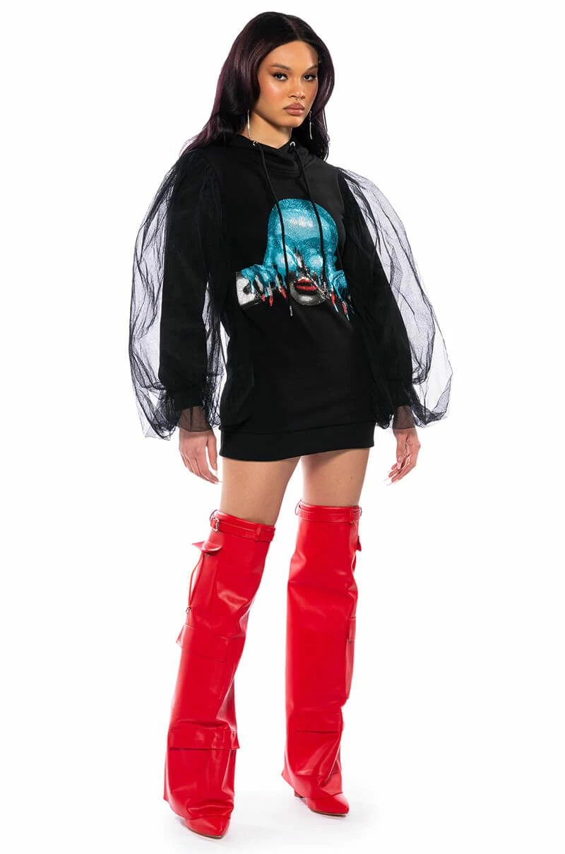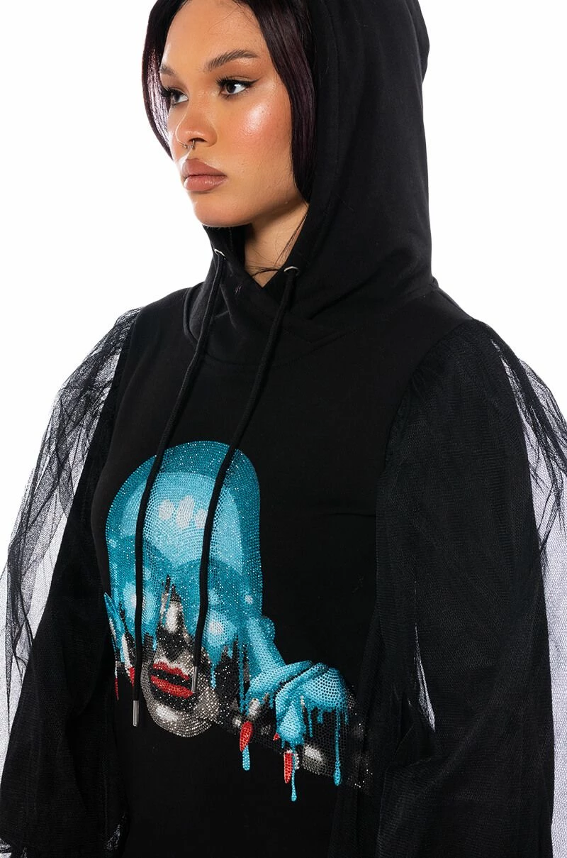 The AKIRA Label Read My Mind Sweatshirt Dress is made from a classic sweatshirt fabrication and features an attached drawstring hood, long sleeves with a puffy mesh top layer and ribbed knit cuffs, a rhinestone-detailed melting silhouette graphic with bold lips and nails, a boxy fit, a mini length silhouette, and a ribbed knit hem. Pair this piece with slick pant boots to complete your look.