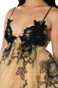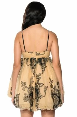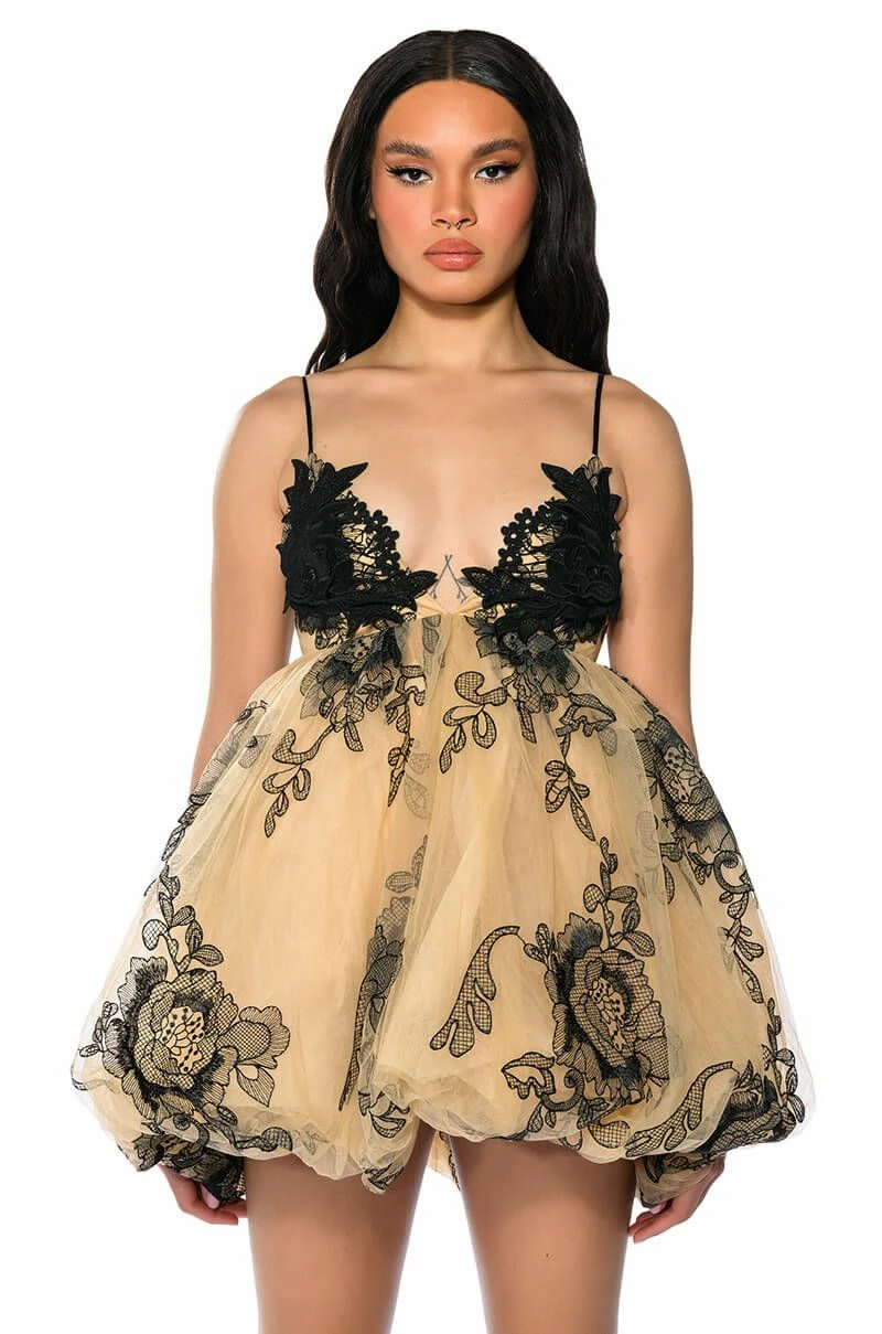 The AKIRA Label Secret Garden Empire Waist Bubble Skirt Mini Dress is a festive floral-embroidered tulle mini dress featuring adjustable spaghetti straps, a plunging neckline, an empire waist silhouette waist, and a voluminous bubble hem. Complete with floral applique bust detailing, a satin inner lining, and a tonal back zipper closure.