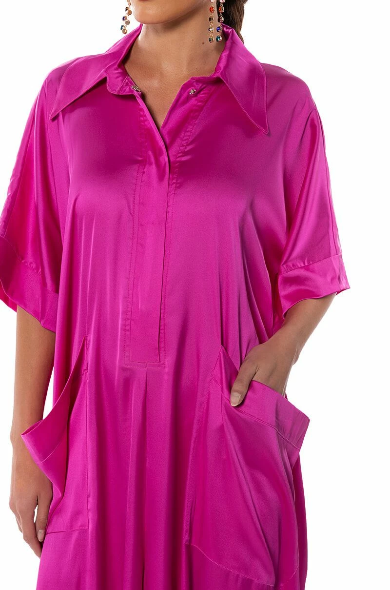 The AKIRA Label Sheβs Rich Oversized Satin Jumpsuit In Pink is a sleek one piece featuring a satin fabrication, a fold over collar, a plunging neckline, boxy short sleeves, roomy front pockets, an oversized fit, and a wide leg silhouette. Complete with pop button front detailing. Pair this piece with platform booties or slip-on pumps to complete your look.