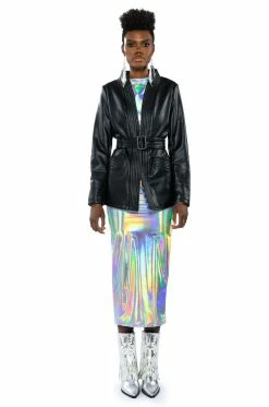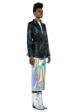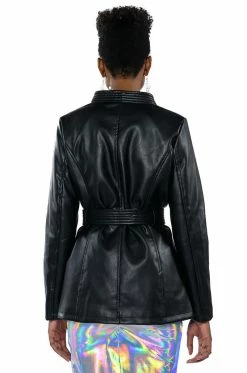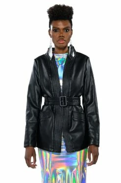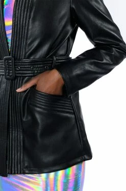 Tens across the board. The AKIRA Label Shes A Ten Belted Faux Leather Moto Blazer is a faux leather piece featuring a standing collar, long sleeves, front pockets, a light polyester lining, and a coordinating waist belt. Pair with midi skirts and sleek ankle booties for a complete look.