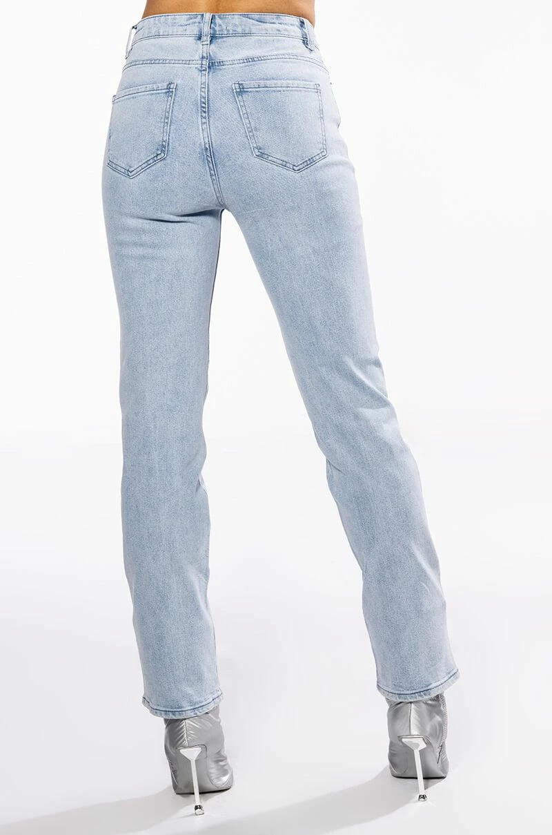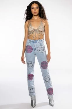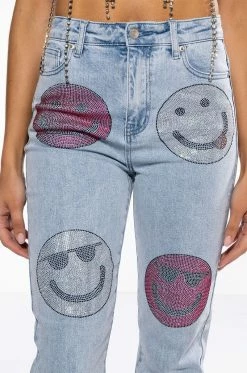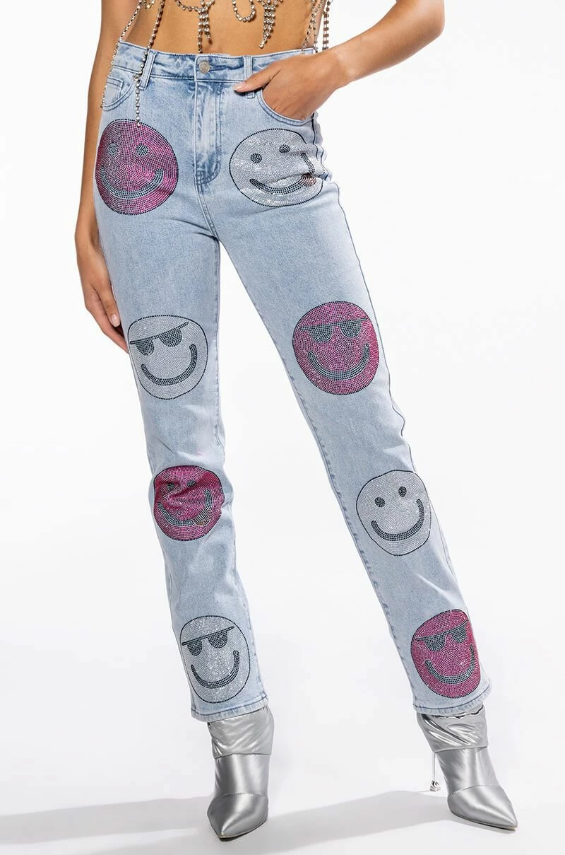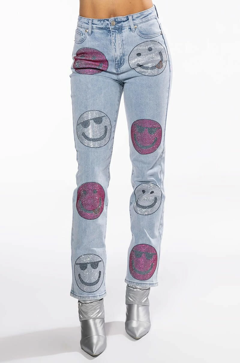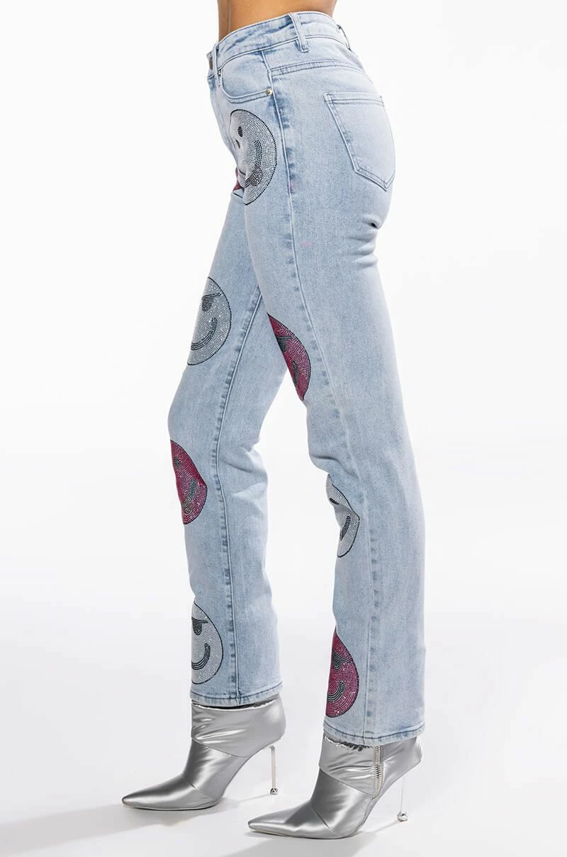 SMILEY FACES RHINESTONE HIGH RISE STRAIGHT LEG JEANS