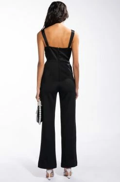 The AKIRA Label Switch It Up Wide Leg Jumpsuit is made from a soft fabrication base and features a satiny bodice with wide tank straps and pleated chest detailing, padded cups, wiring for structure, slant side pockets, wide pant legs, and a tonal back zipper closure.