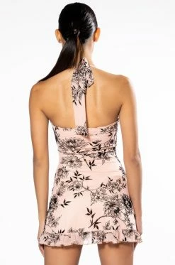 The AKIRA Label Take Me There Floral Mini Dress is a romantic mini featuring a mesh overlay, floral velvet burnout print patterning, tie back halter tank straps, a sweetheart neckline, inner elastic trim, and ruffle trim detailing. Complete with a mini length, a subtle front slit accent, and a smooth inner lining.