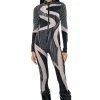 The AKIRA Label Talk To Me Mesh Detail Sleeveless Jumpsuit is a sexy pleather one piece featuring slim, adjustable tank straps, a scoop neckline, attached skinny leg pants, and a sexy bodycon fit. Complete with sheer mesh panel detailing and a high cut velvet bodysuit overlay. Style this piece under a jean jacket for a sexy layered look.