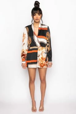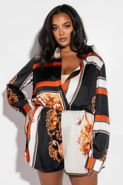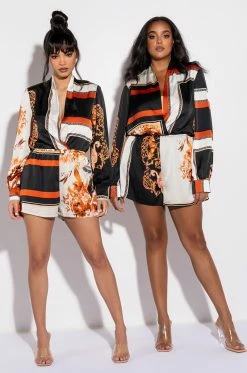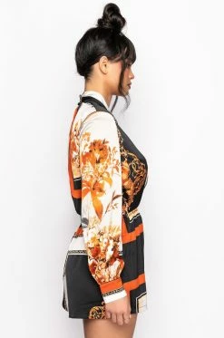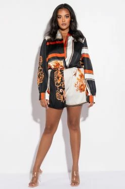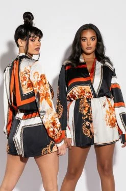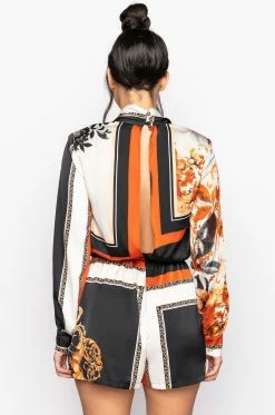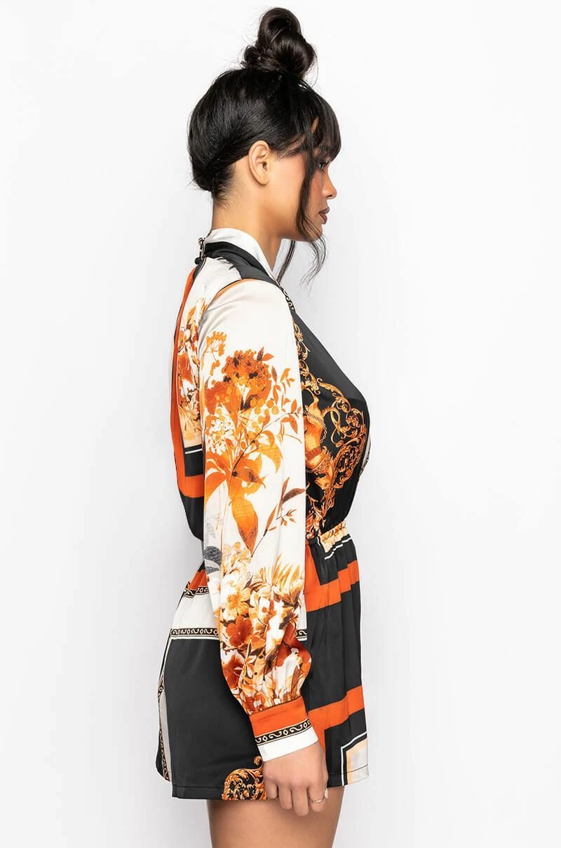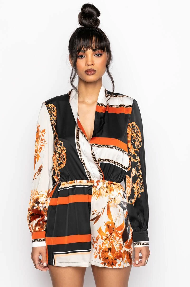 The AKIRA Label Talk To Me V Neck Romper features a vintage-inspired scarf print, a luxe satin fabrication, long button cuff sleeves, padded shoulders, a plunging neckline, and an elastic waistband. Complete with a hick neck collar and back of the neck button detailing