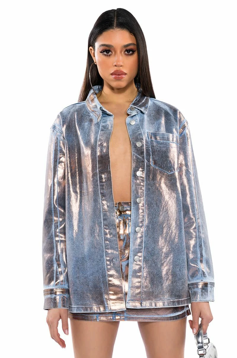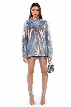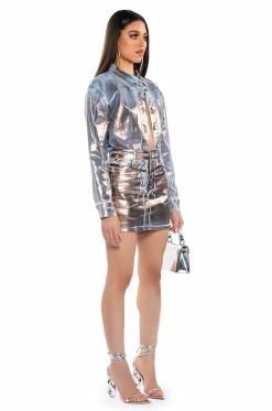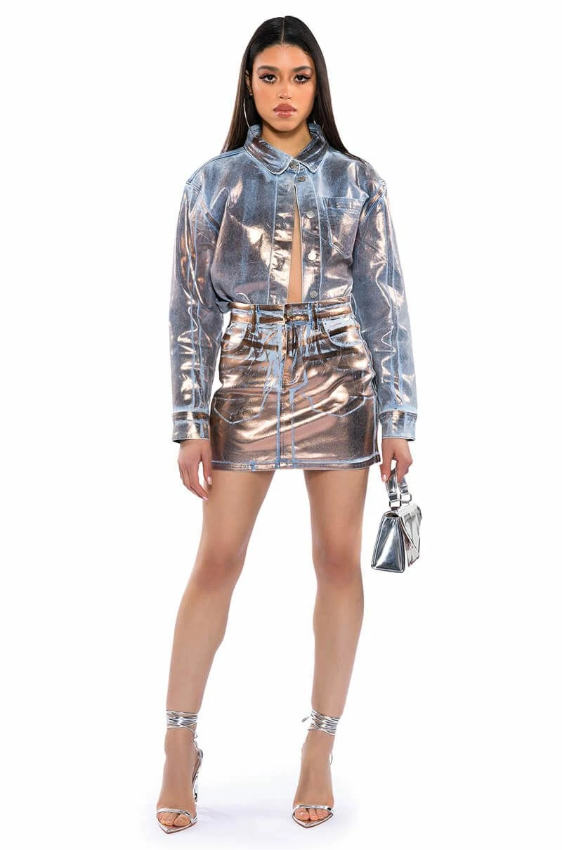 The AKIRA Label Teleport Foil Effect Denim Mini Skirt is made from a washed denim fabrication base and features metallic foil detailing, a high rise waist, working belt loops, slant side pockets, back pockets, a mini length silhouette, and a button and zipper front closure. Pair this piece with the coordinating AKIRA Label Teleport Foil Effect Denim Button Down to complete your look.