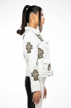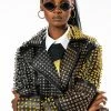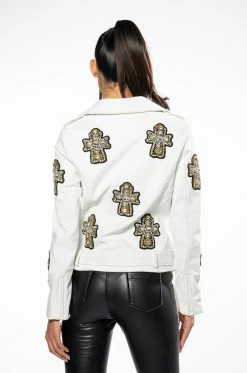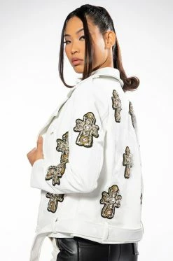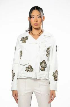 The AKIRA Label Thank God For Me Rhinestone Embellished PU Moto Jacket is made from a textured vegan leather fabrication and features a studded notch collar, shoulder epaulets, ornate rhinestone cross patch detailing, long sleeves with zippered cuffs, zippered chest pockets and a flap pocket, waist belt loops with a coordinating vegan leather buckle belt, light polyester lining, and a front zipper closure.