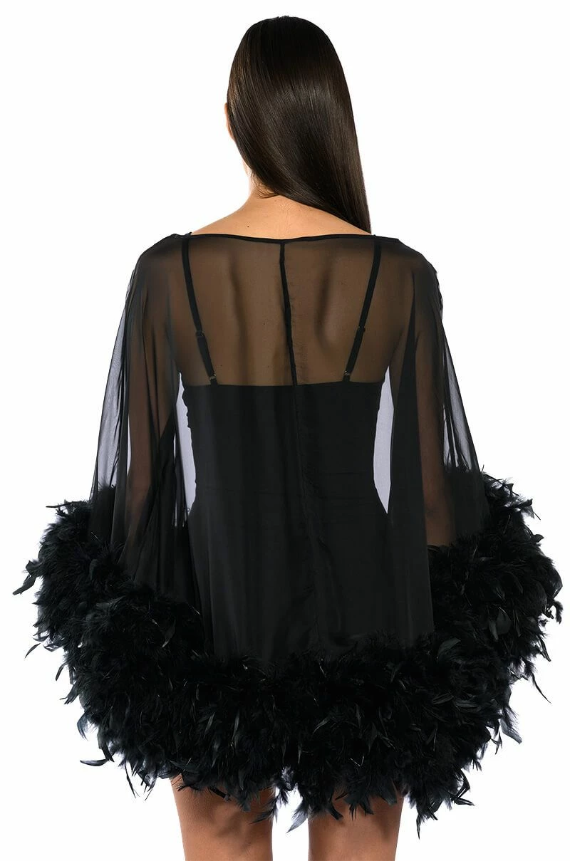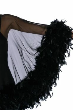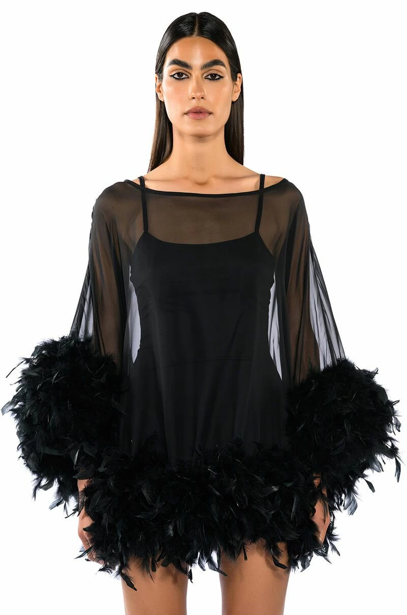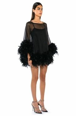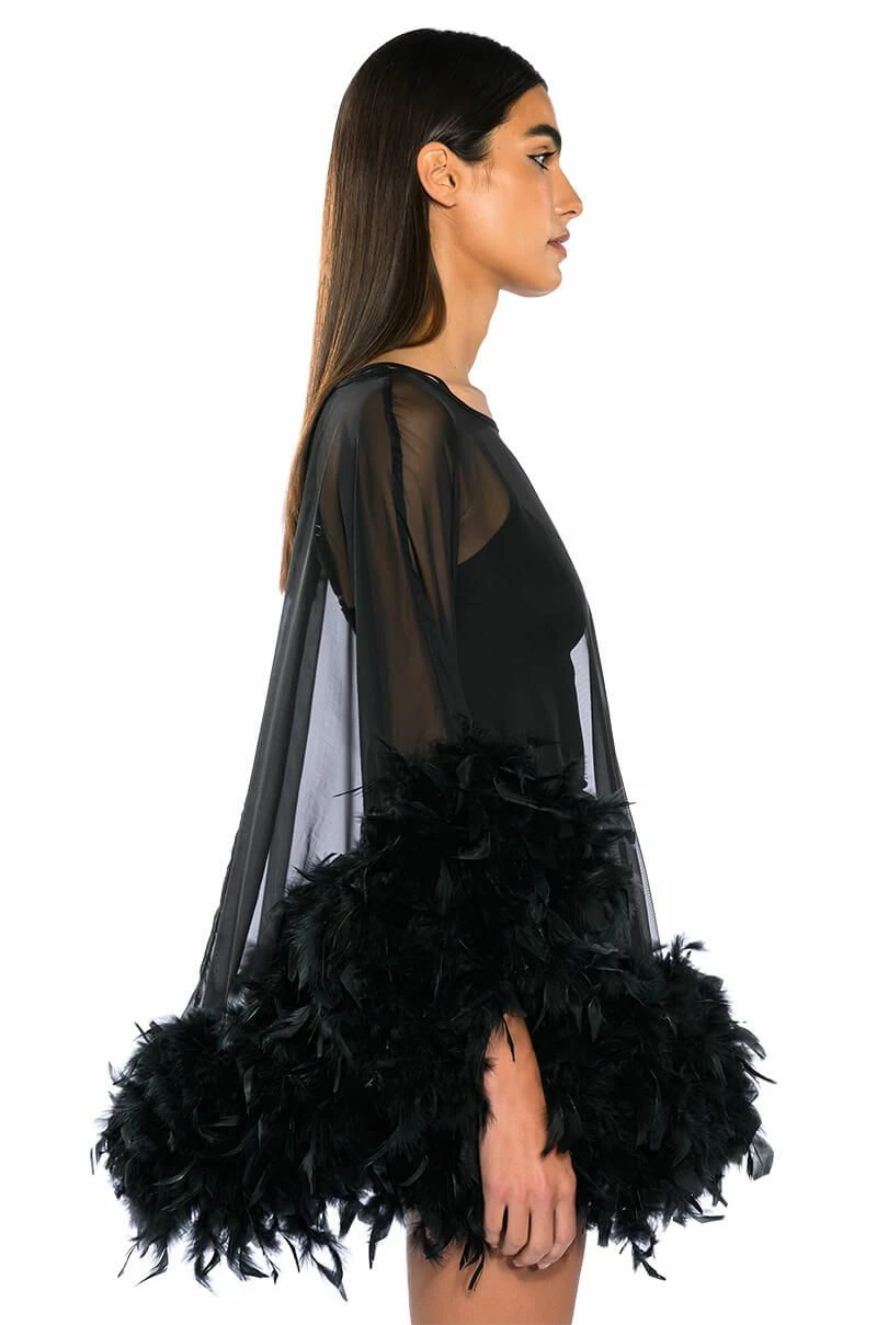 The AKIRA Label That Va Va Voom Long Sleeve Sheer Trapeze Dress is made from a from a sheer, lightweight fabrication and features an asymmetrical neckline, one long sleeve, a trapeze-style design, a mini length silhouette, a pull-on fit, and a layered, opulent feather trim hem. Complete with an included inner tank slip dress made from a slick fabrication with a rounded neckline and adjustable spaghetti straps.