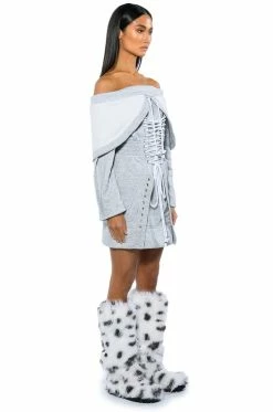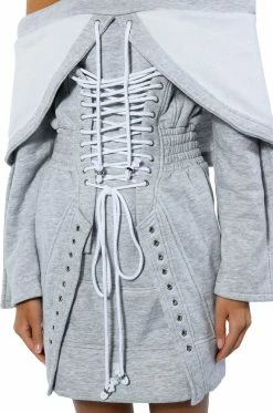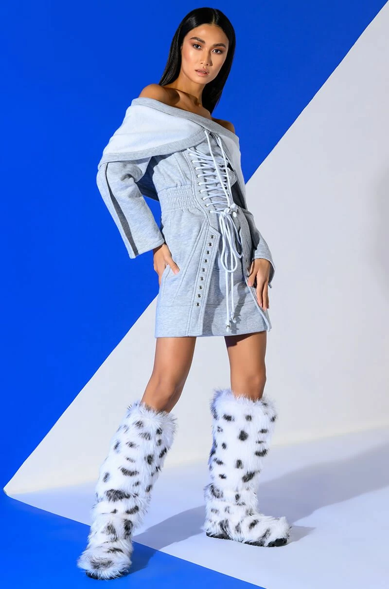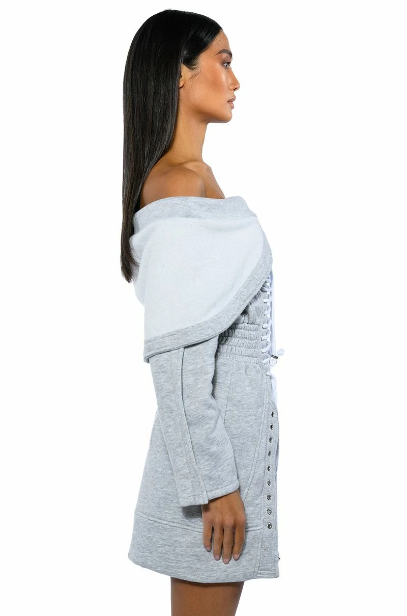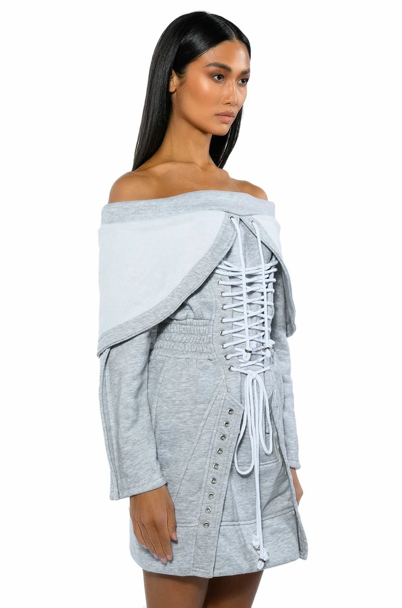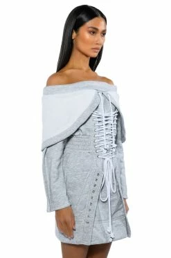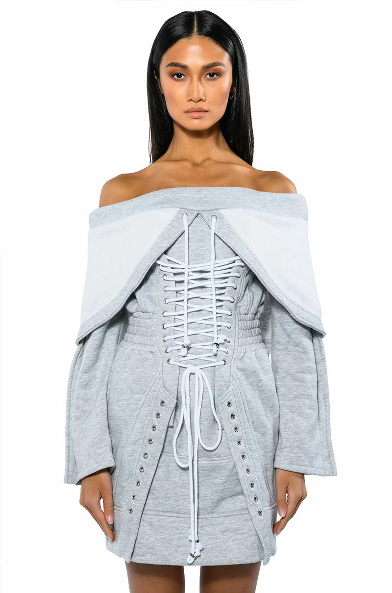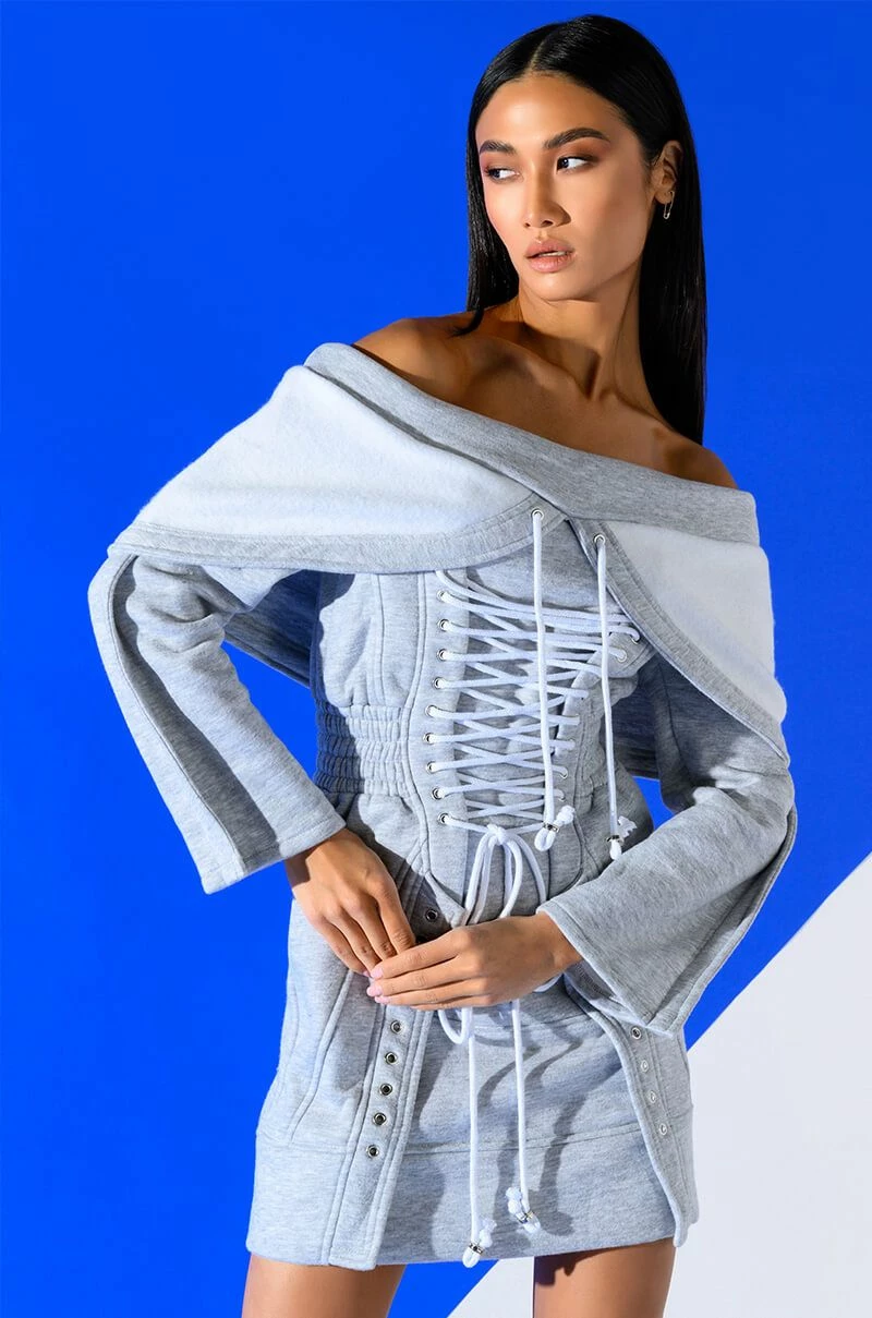 The AKIRA Label Tied Up In Love Off Shoulder Corset Sweatshirt Dress is made from a cozy sweatshirt fabrication and features an off shoulder neckline with string detailing, long sleeves, a shirred elastic waist, a mini length silhouette, lace-up front detailing, and a slip-on fit. Pair with chunky sneakers to complete your cozy cute look!