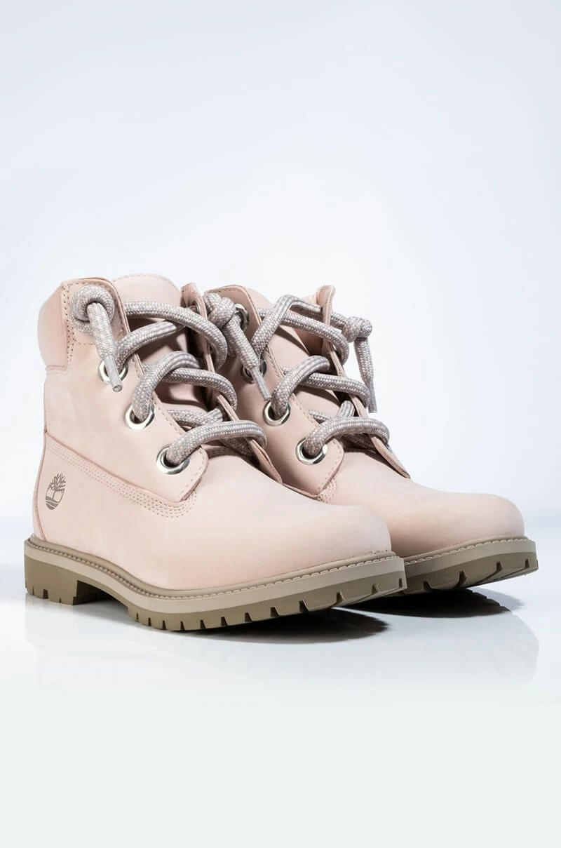 Convenience and comfort meets classy combat. This Timberland Heritage 6” Waterproof Convenience Lace Bootie is made of a dusty pink genuine suede upper with a durable slate grey sole. Features a rounded toe, oversized silver bolt-shaped grommets to host oversized grey and pink laces. Also features the classic Timberland logo on the exterior of the heel. Wear with classic grey sweats and soft pink accents for a soft yet solid weatherproof look.
