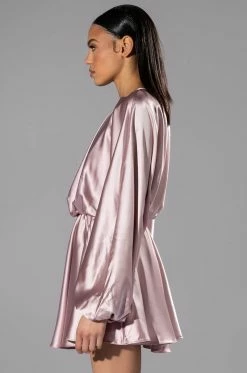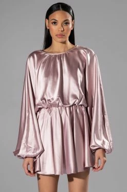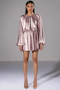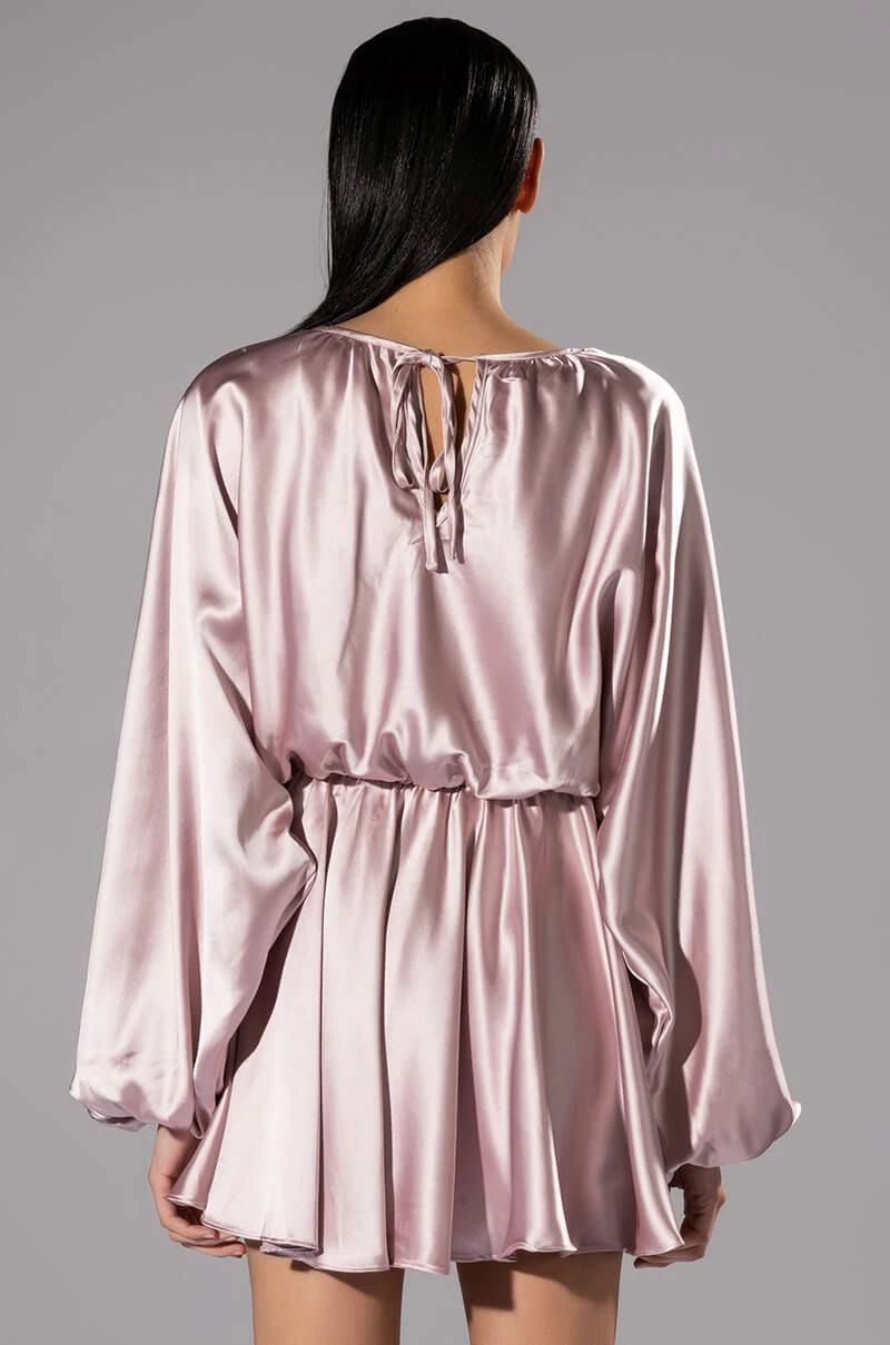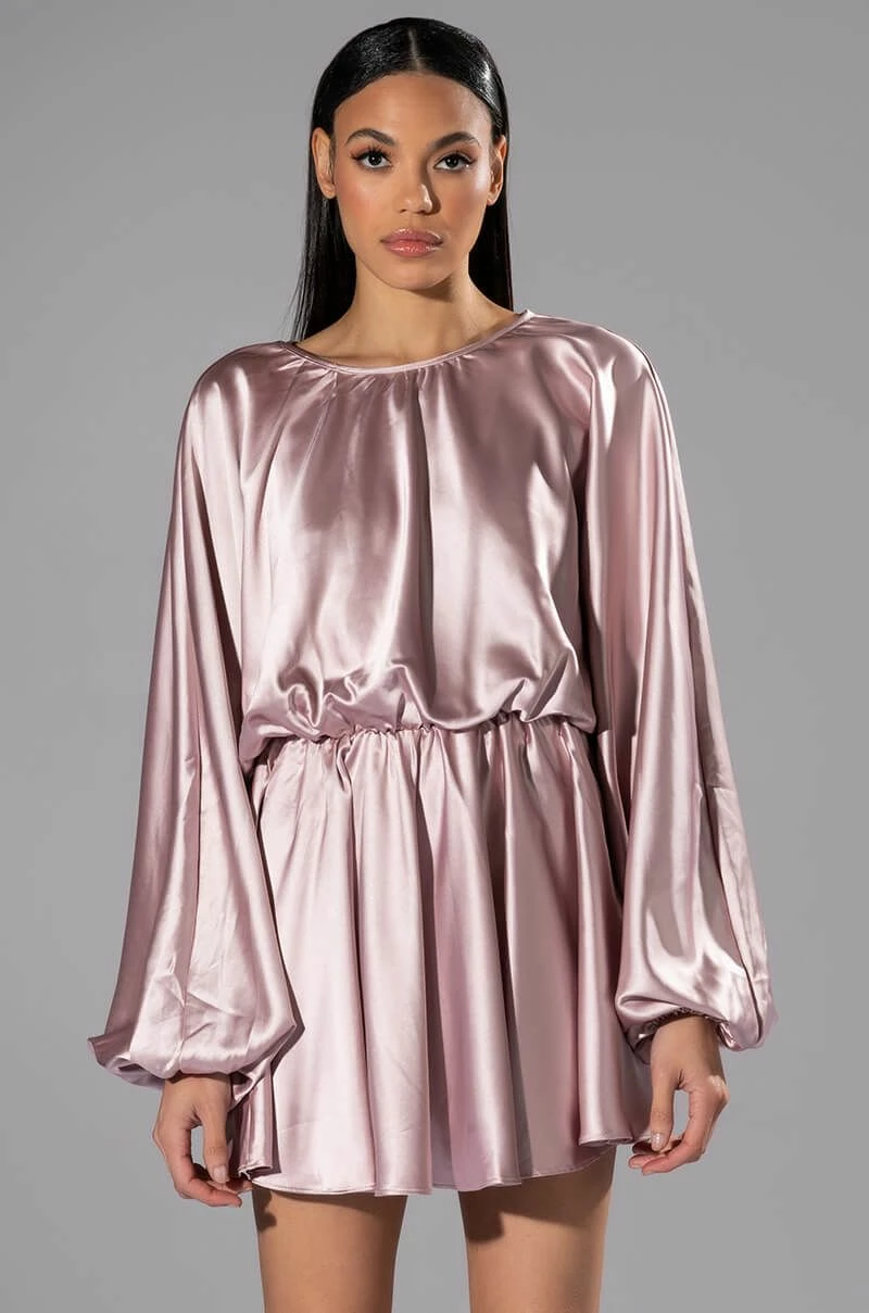 The AKIRA Label Time To Dine Long Sleeve Mini Dress is made from a slick satin fabrication and features a rounded neckline, long blouson sleeves, an elastic waist, a flared skirt, an inner slip, and a mini length silhouette. Complete with a keyhole back and a tie closure.