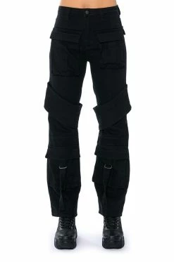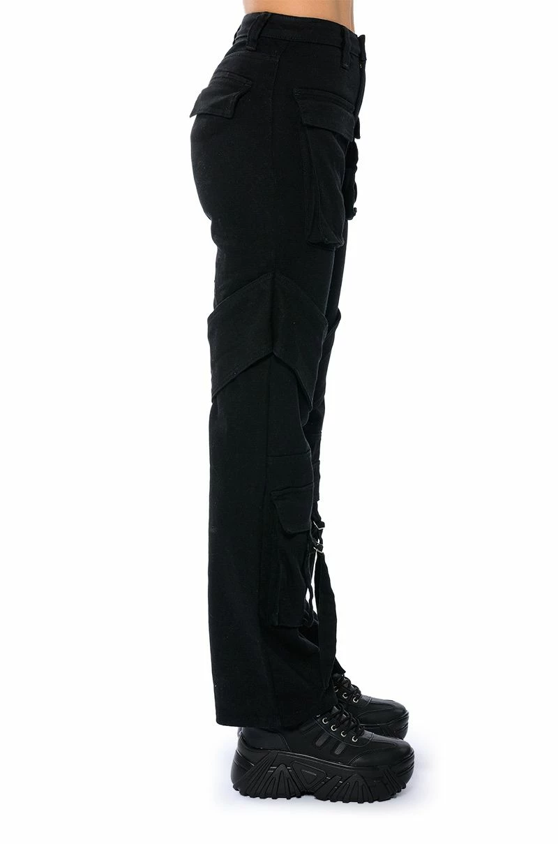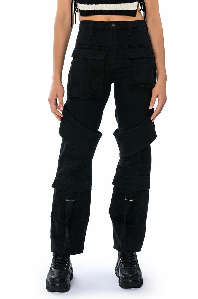 The AKIRA Label Too Cool Cargo High Waisted Jeans are a 2023 denim essential. Made with a structured cotton blend fabrication, these cargo pants feature a high-waisted, wide-leg design, deep front cargo flap pockets, and buckled cargo flap pockets at the bottom hems. Complete with wide utility bands around the thighs, back flap pockets, and a classic zip-up button closure. Pair with a long sleeve turtleneck and chunky platform boots for a sleek look.