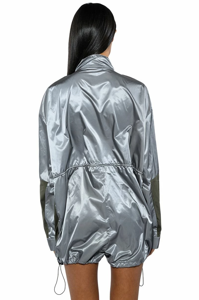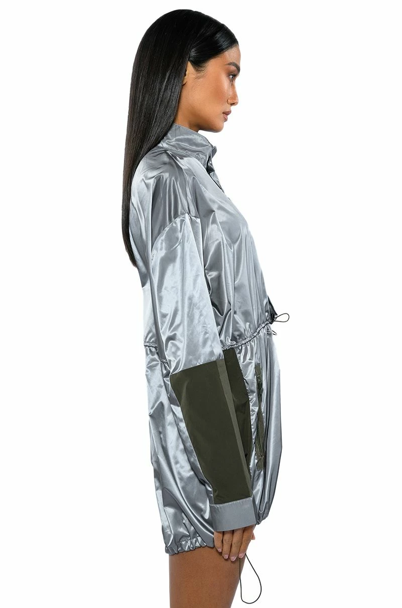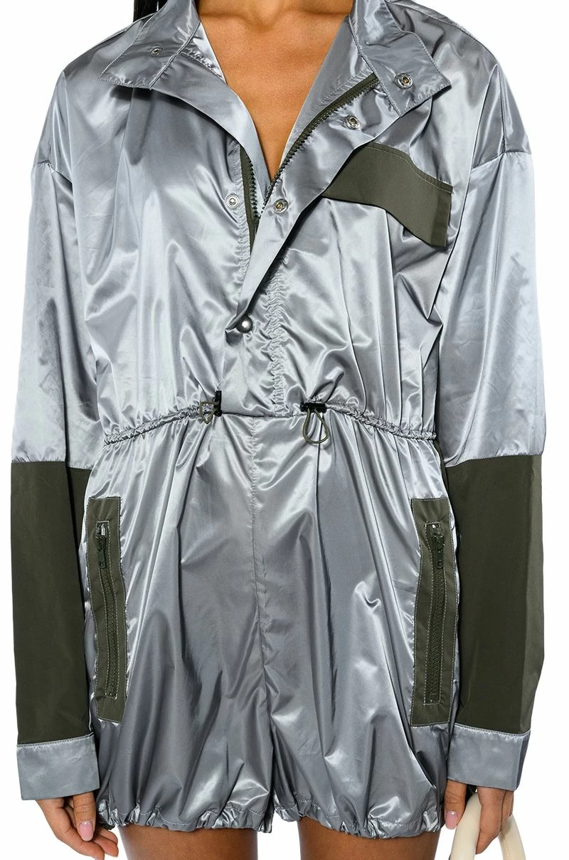 The AKIRA Label Unbothered Sporty Long Sleeve Romper features a satin-y windbreaker-inspired fabrication, a mock neck silhouette, attached shorts, long sleeves, a faux flap front chest pocket, and an adjustable ruched elastic waistband with toggle closures. Complete with zippered side pockets, a zip front closure, a pop button down front placket, and adjustable toggle hem detailing.