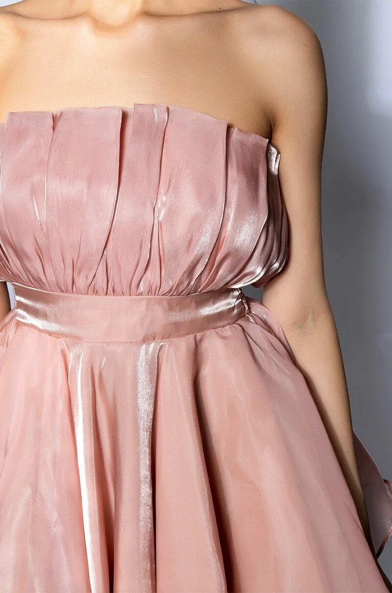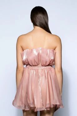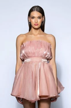 The AKIRA Label Uplift Flounce Mini Dress is made from a sheer, shimmery fabrication and features a strapless, pleated neckline, a wide waistband with a ruched elastic back, a flouncy skirt with a structured inner slip, a mini length silhouette, and an exposed back zipper closure. Pair this flirty piece with platform pumps and a pearl clutch to complete your look.