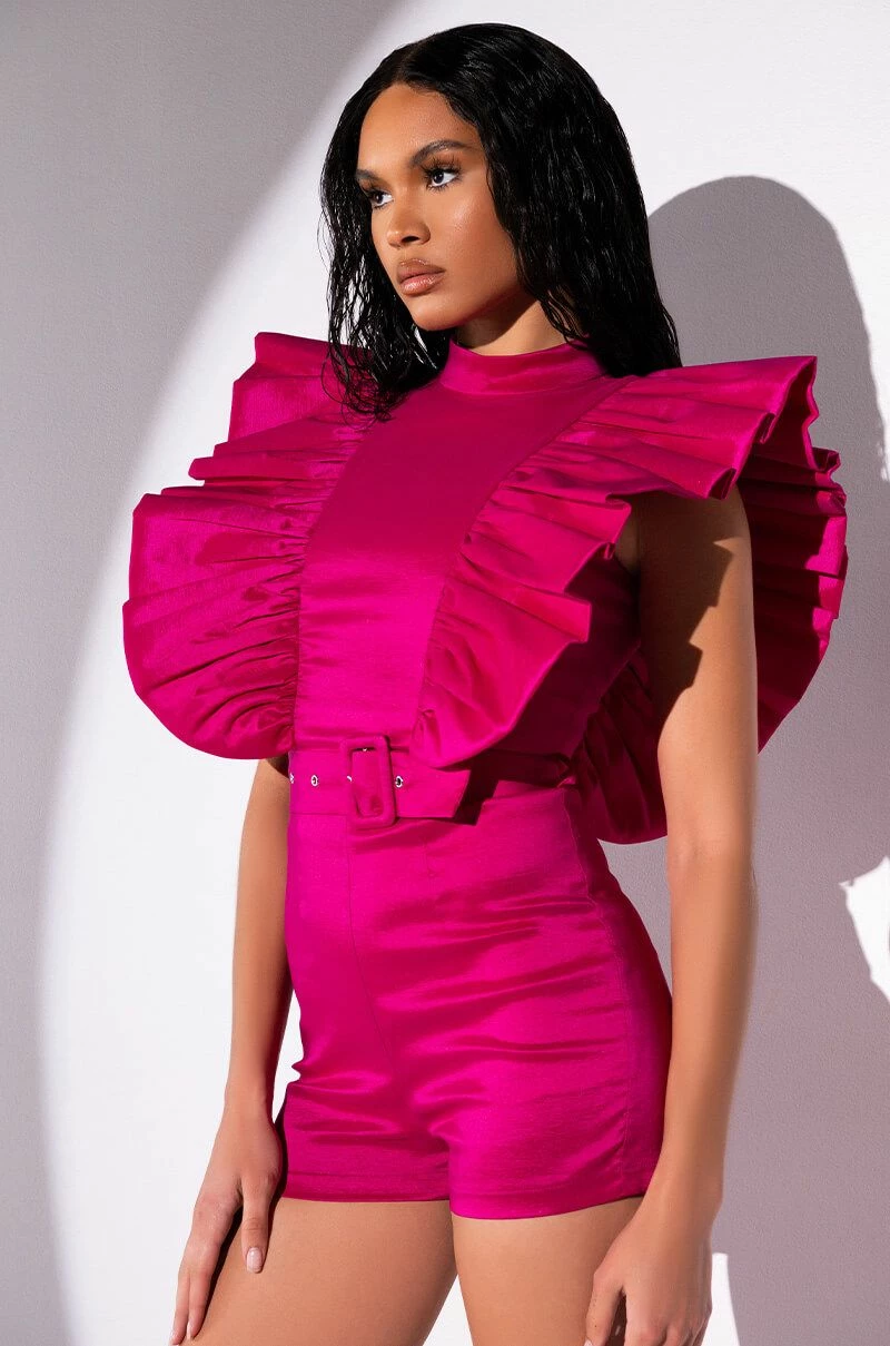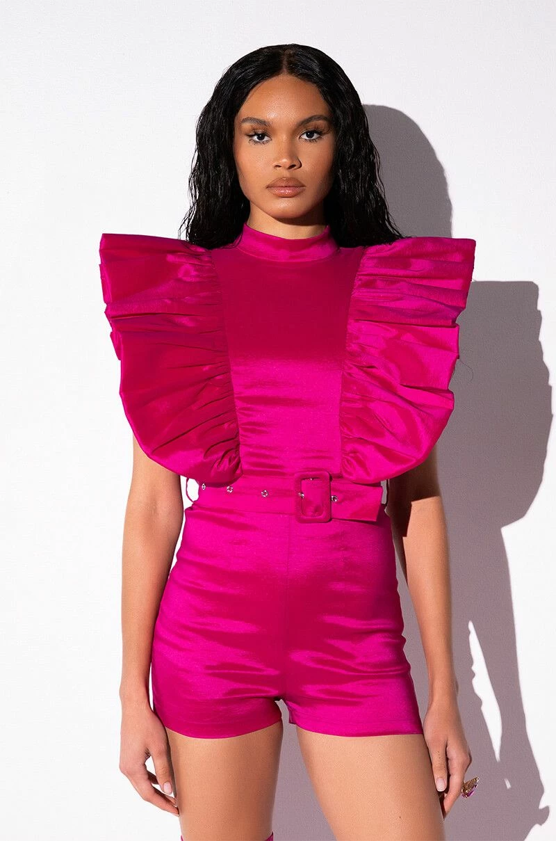 The AKIRA Label Valentina Taffeta Ruffle Sleeve Romper features a shimmering, textured taffeta fabrication, a mock neckline, a cap sleeve design, and ruffle trim detailing through the bodice and back. Complete with an adjustable waist belt, attached mini shorts, and a concealed back zipper closure.